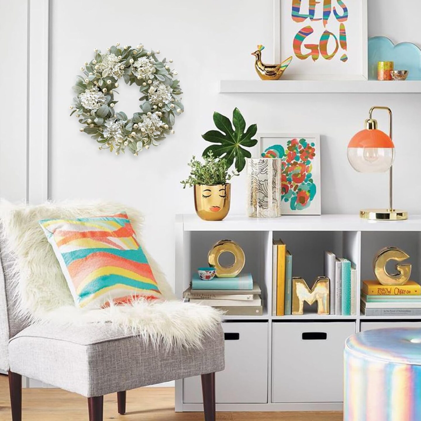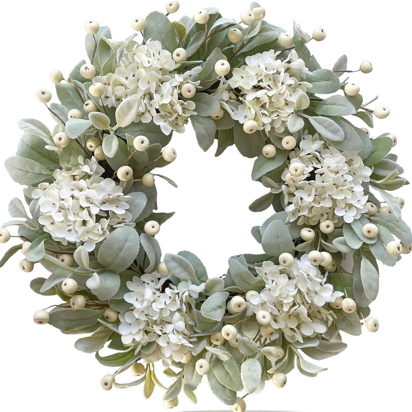 22 Inch Lambs Ears Leaves Everyday Wreath with Ivory Hydrangea and Cream Berries, Spring Summer Greenery Wreath with Burlap Ribbon Bow Knot for Doors, Rustic and Farmhouse Style Home Decor