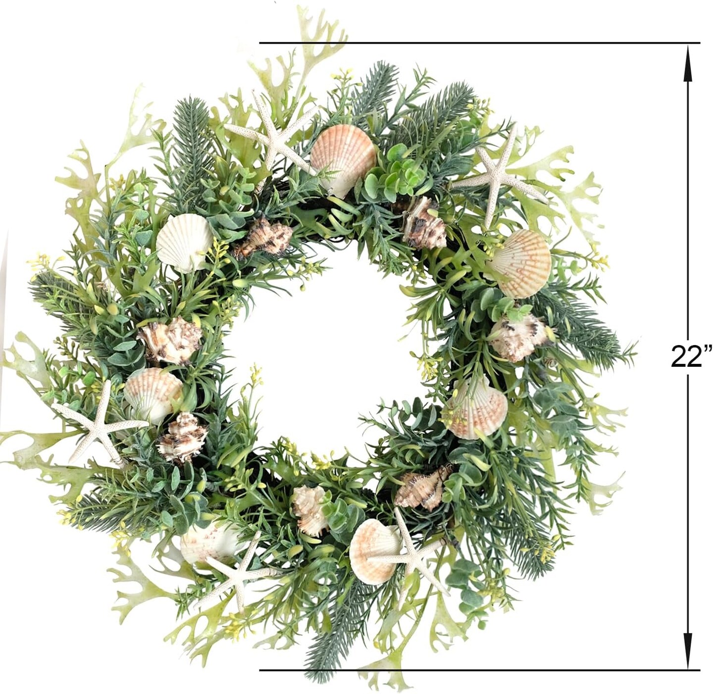 22 Inch Seashell Wreath with Green Leaves – Rustic Farmhouse Coastal Wreath with Starfish and Conch Shells for Front Door, Wedding, and Summer Home Decor