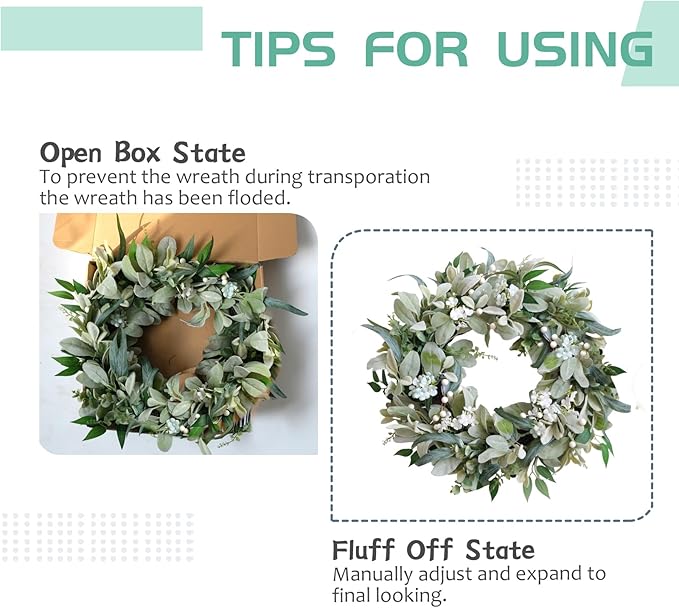 22 Inch Spring Everyday Lamb Ears Leaves Wreath with White Wild Flowers and Berries for Front Door, Welcome Wood Sign Green Leaves Wreath for Indoor Outdoor, Everyday Leaves Home Decor
