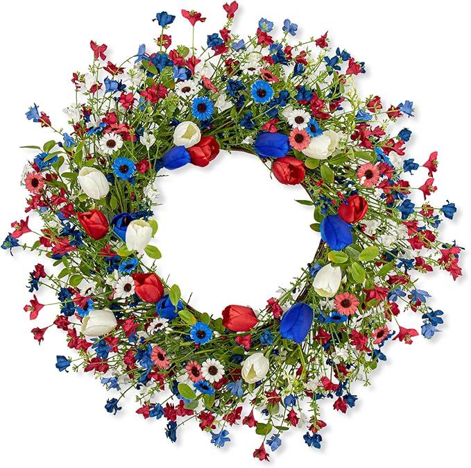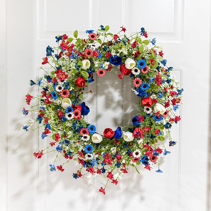 22 Inches Patriotic Wreaths for Front Door 4th of July Wreath Independence Day Wreath with Red White and Blue Tulip Flowers for Window Wall Front Porch Memorial Flag Day 250th Anniversary USA Decor