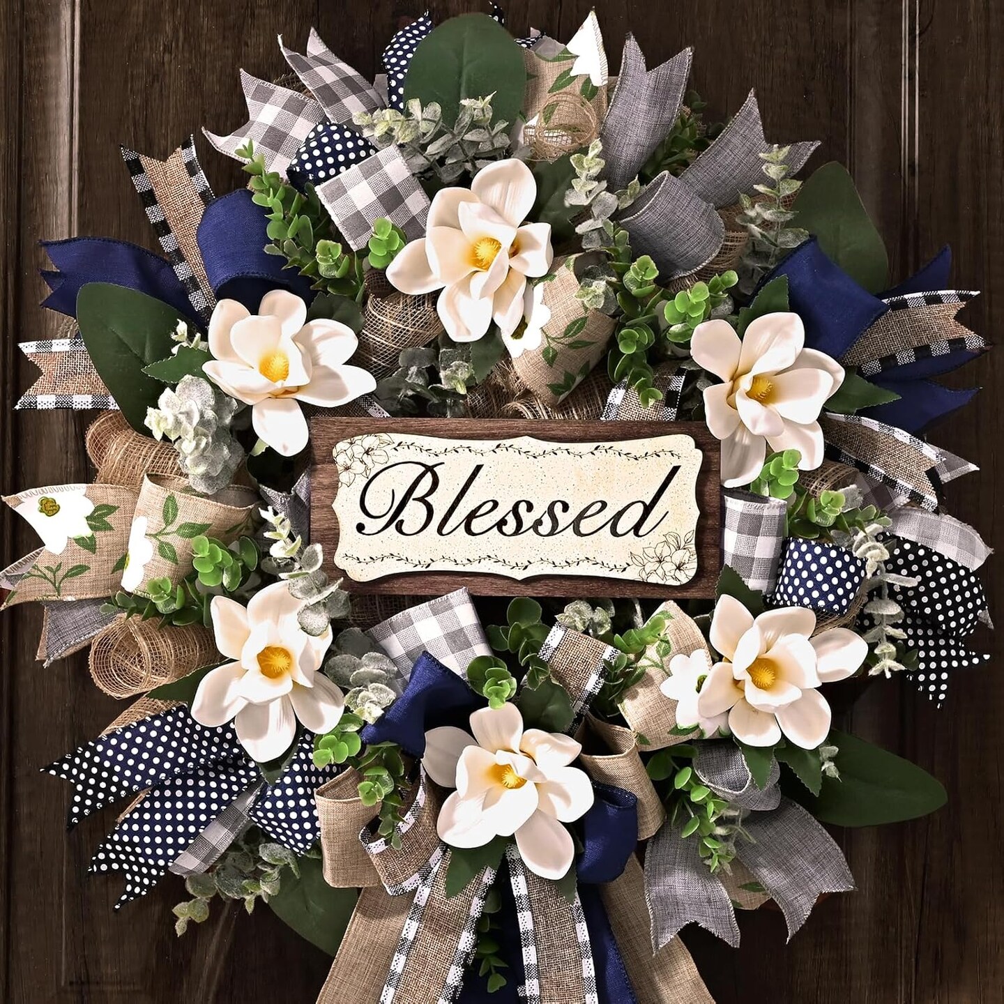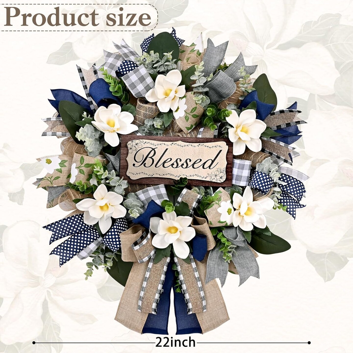 22" Magnolia Spring & Summer Wreath – Front Door, Porch & Wall Decor with Eucalyptus, Blue-Grey Burlap Bow, Year-Round Farmhouse Home Decoration