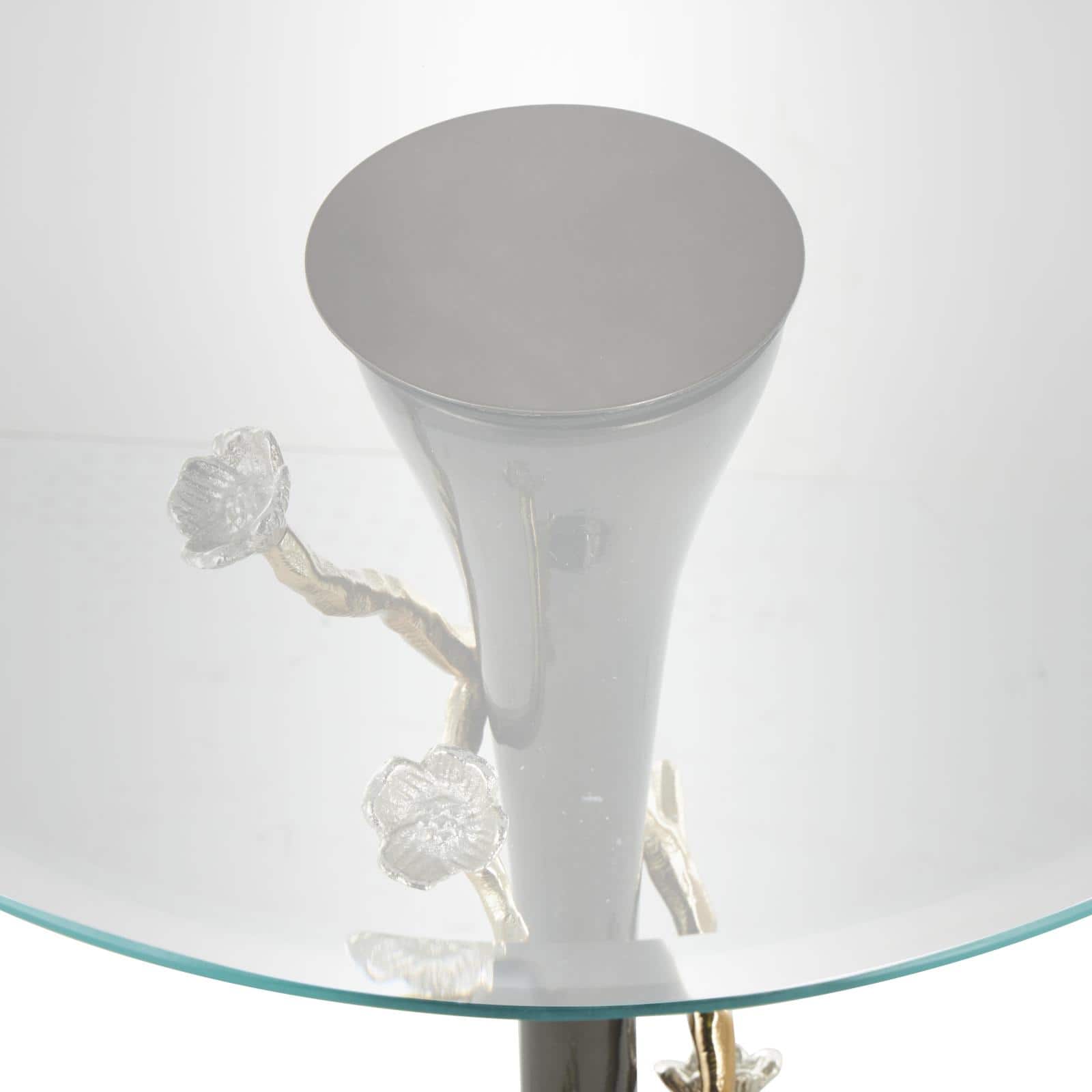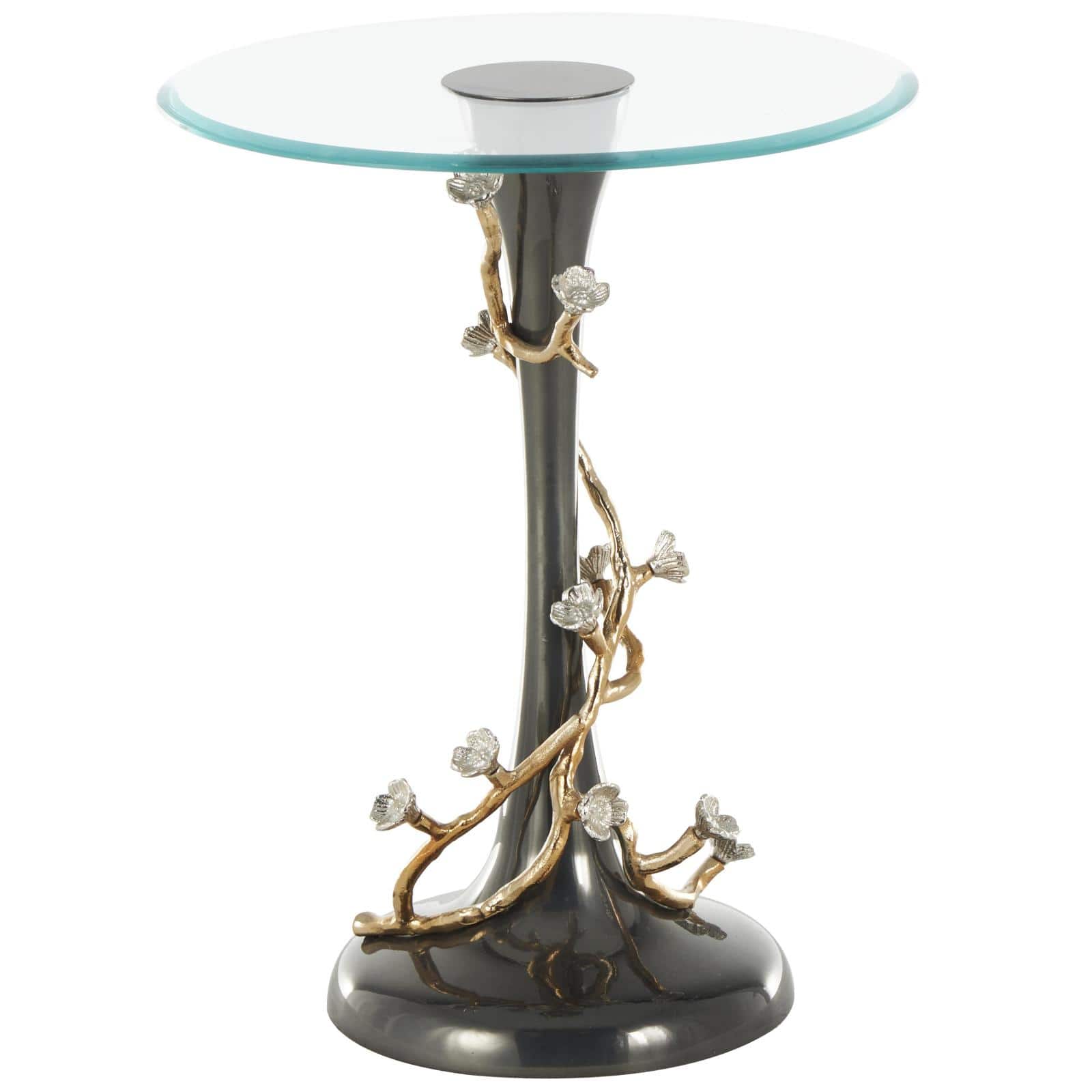 22.75" Black Aluminum Floral Twisted Vine Accent Table with Gold & Silver Accents & Glass Tabletop