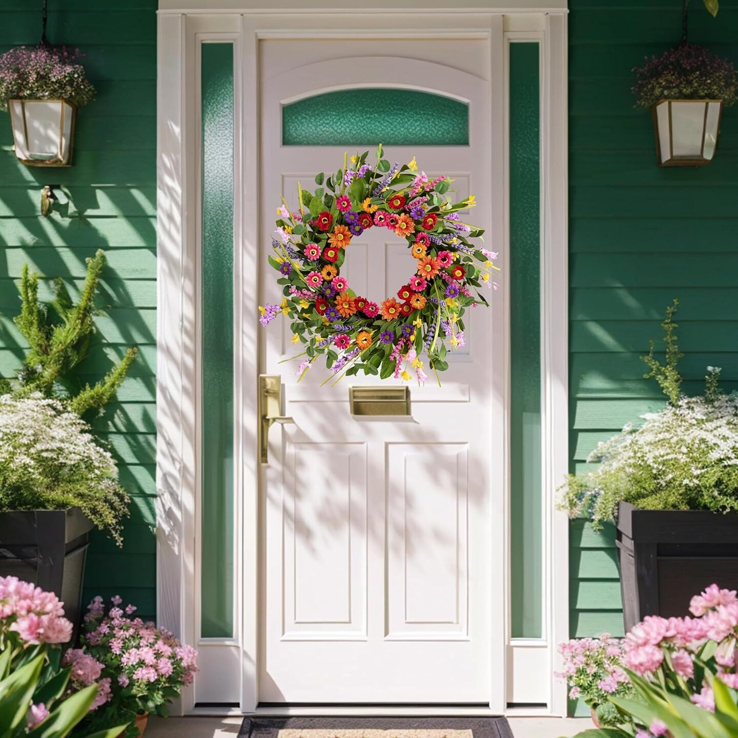 22-Inch Artificial Spring Wreath featuring green eucalyptus leaves, pink daisies, and lavender—perfect for front doors, farmhouse walls, weddings, porches, and Easter décor.