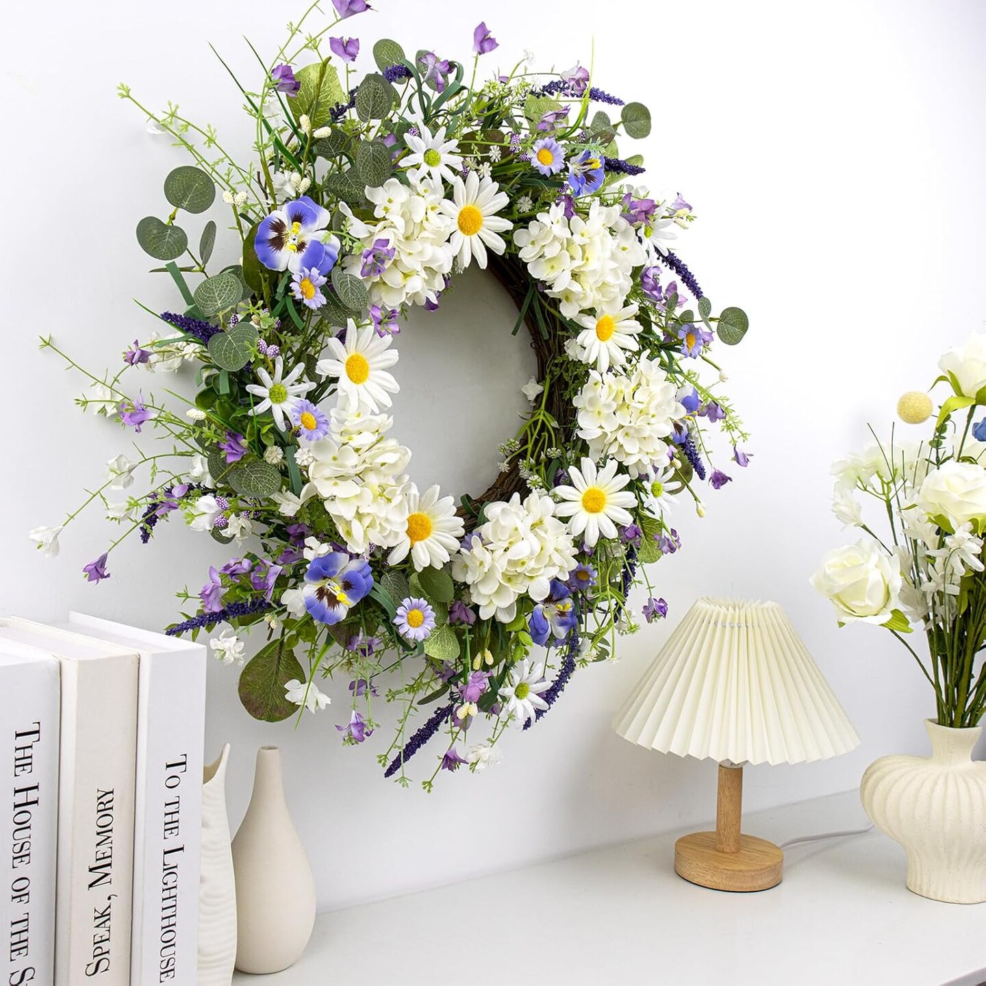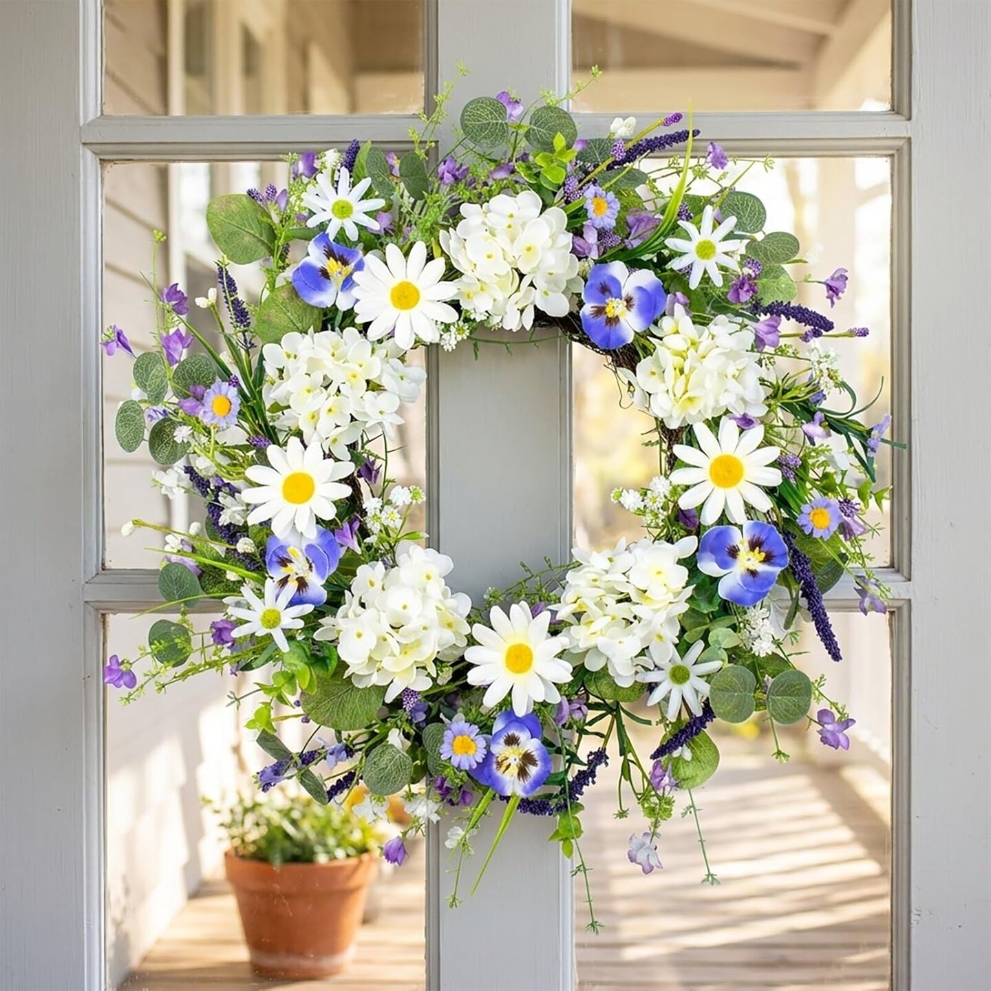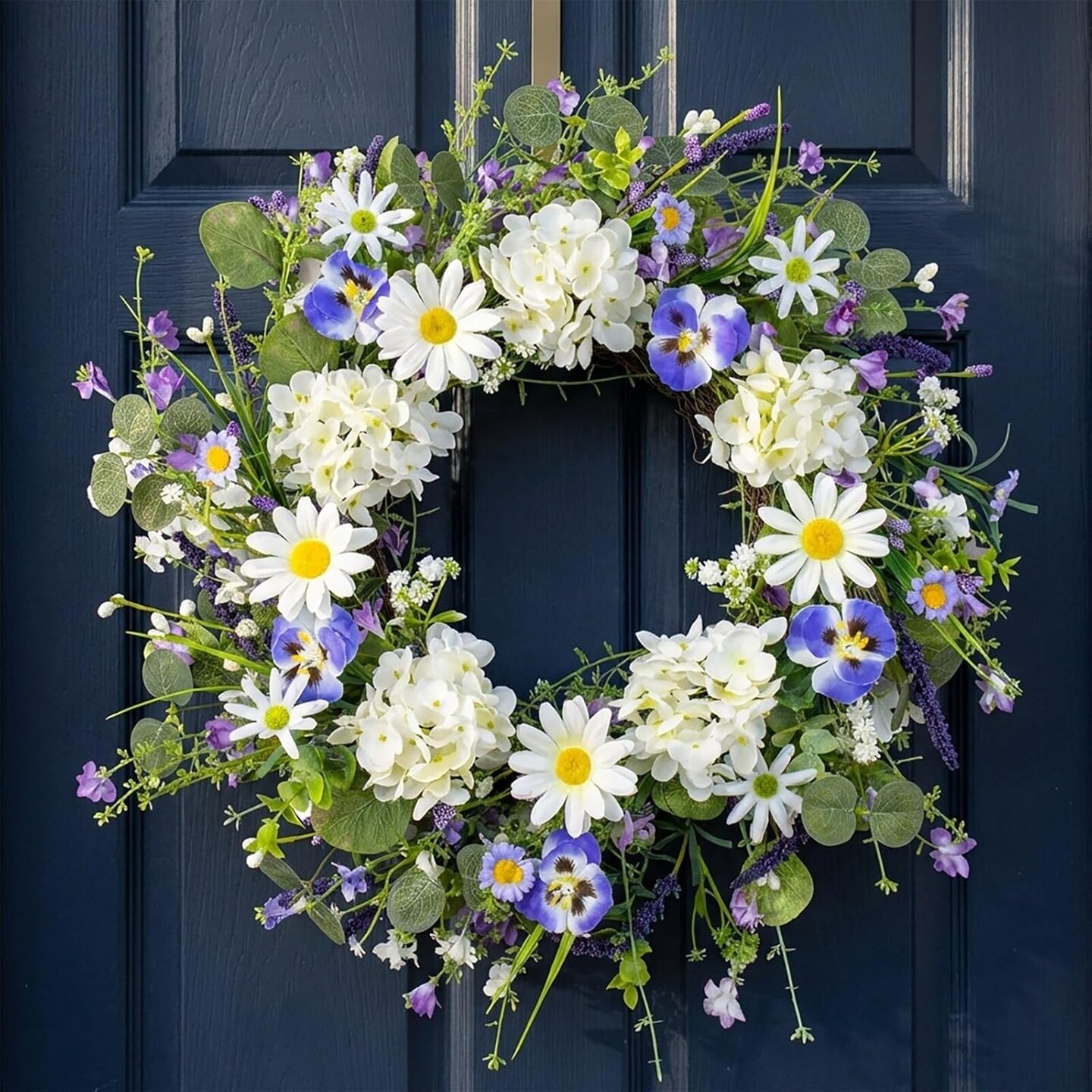 22-Inch Spring Wreath for Front Door – Sunflowers, White Hydrangeas & Blue Phalaenopsis Orchids, Farmhouse Floral Wreath for Window, Wall, Porch Decor