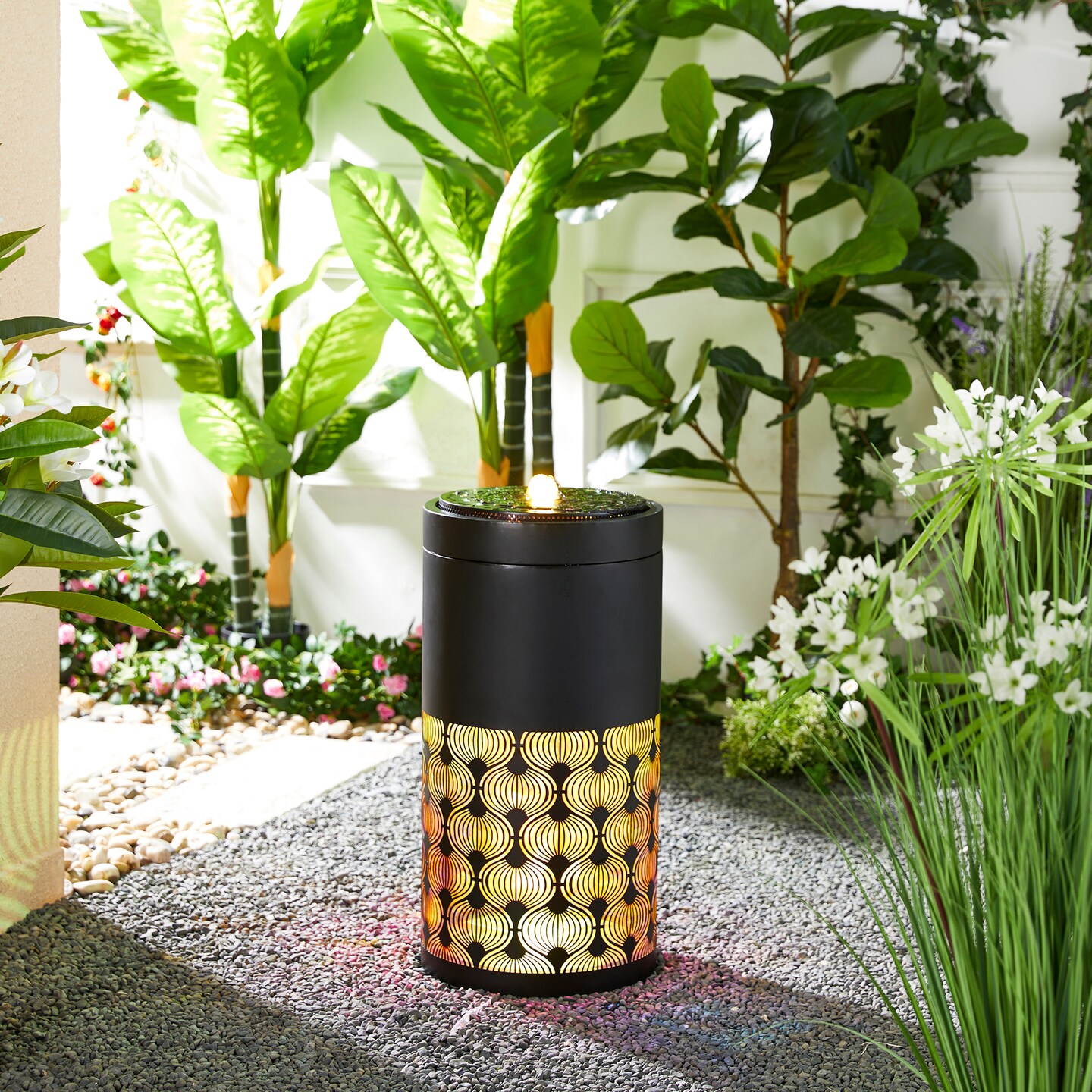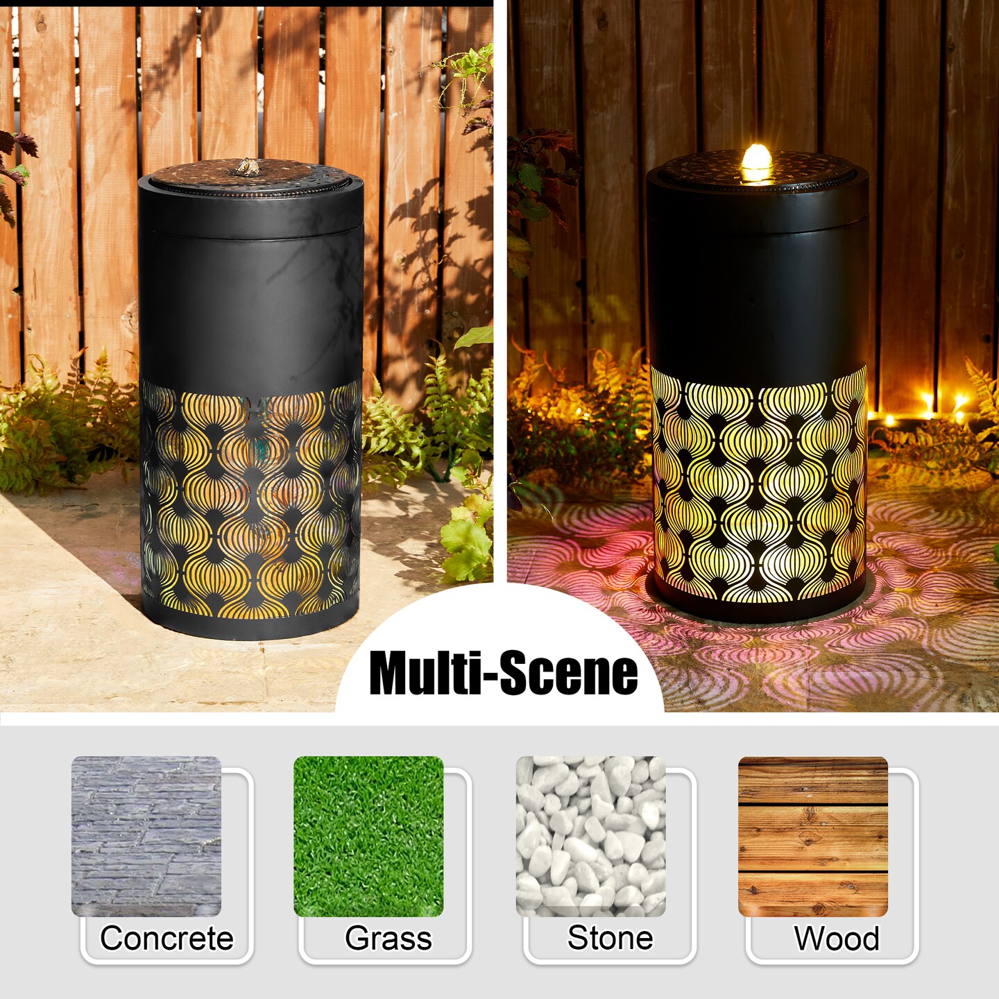 24''H Metal Cutout Pattern Outdoor Fountain with Laser Cut Panels, Pump and LED Light