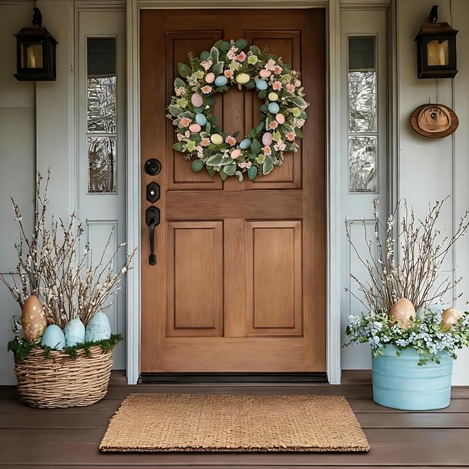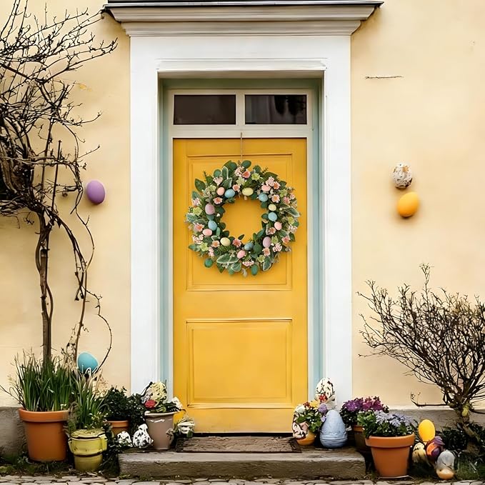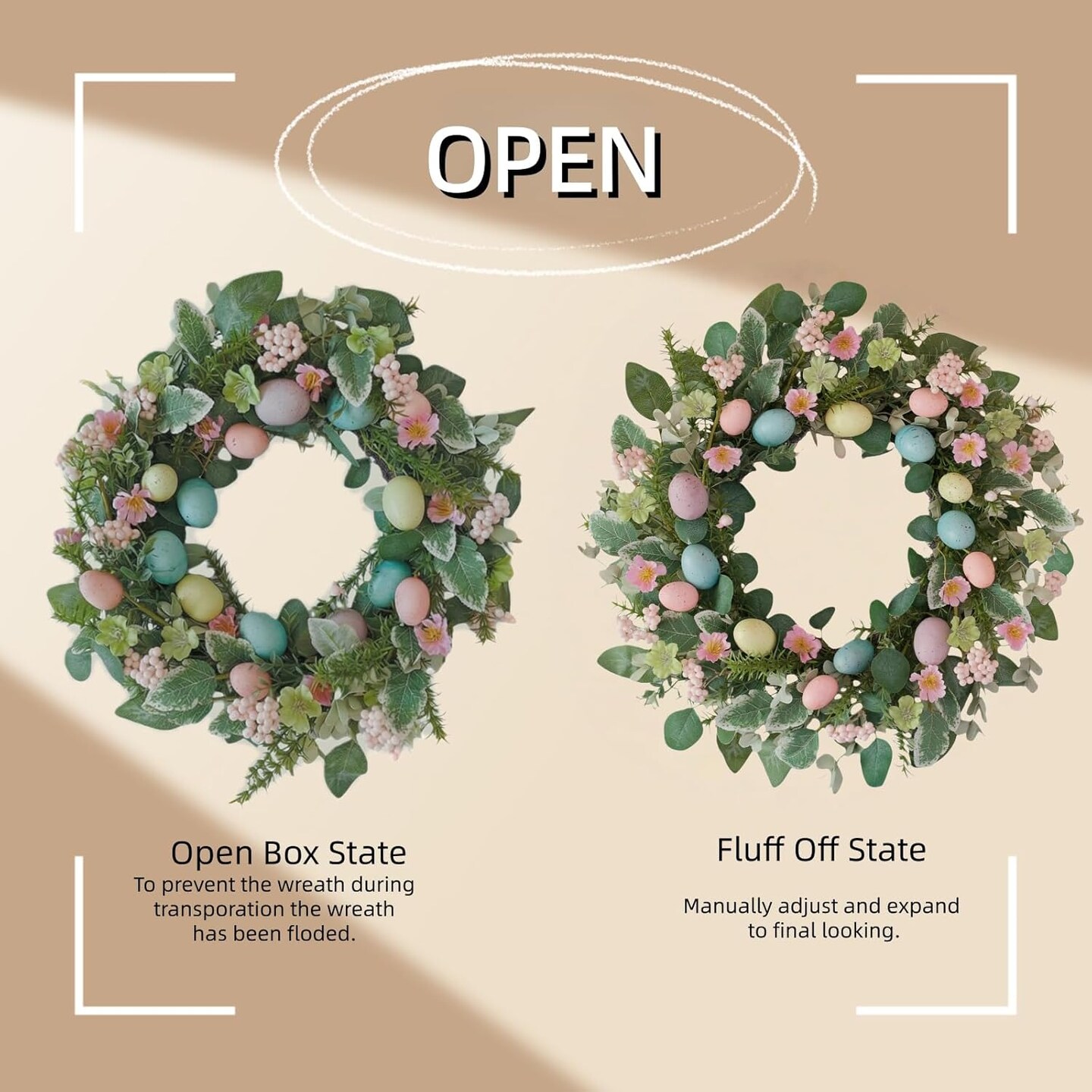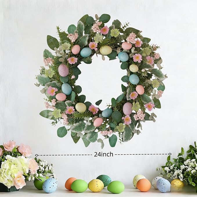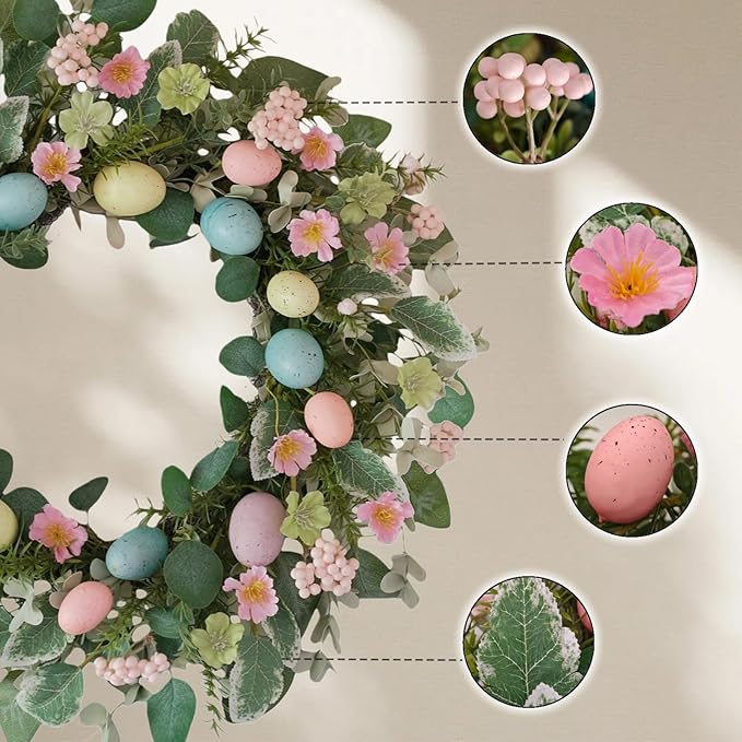 24 Inch Easter Wreath for Front Door - Spring Summer Decor with Pink Berries, Eucalyptus Leaves, Faux Eggs & Fabric Flowers, Indoor Outdoor Wall Window Wedding Home Decor