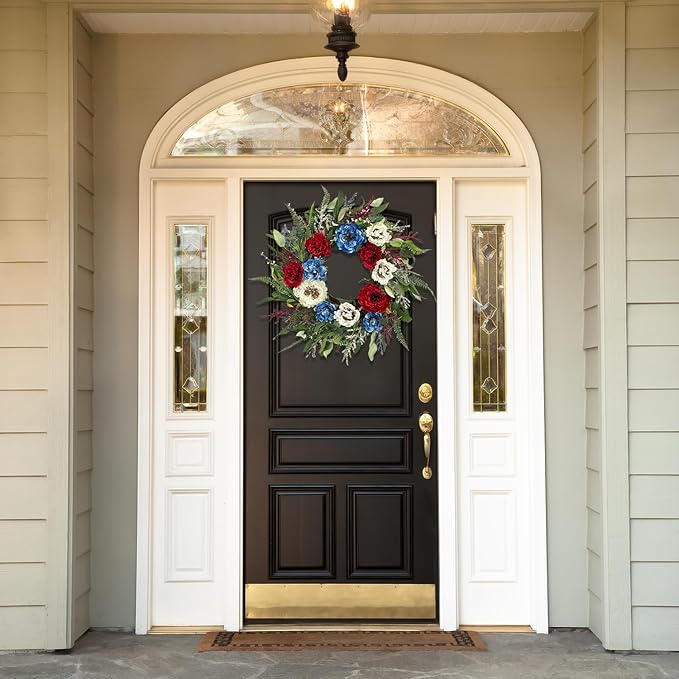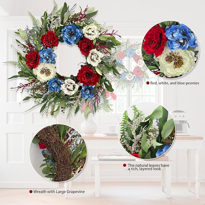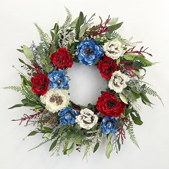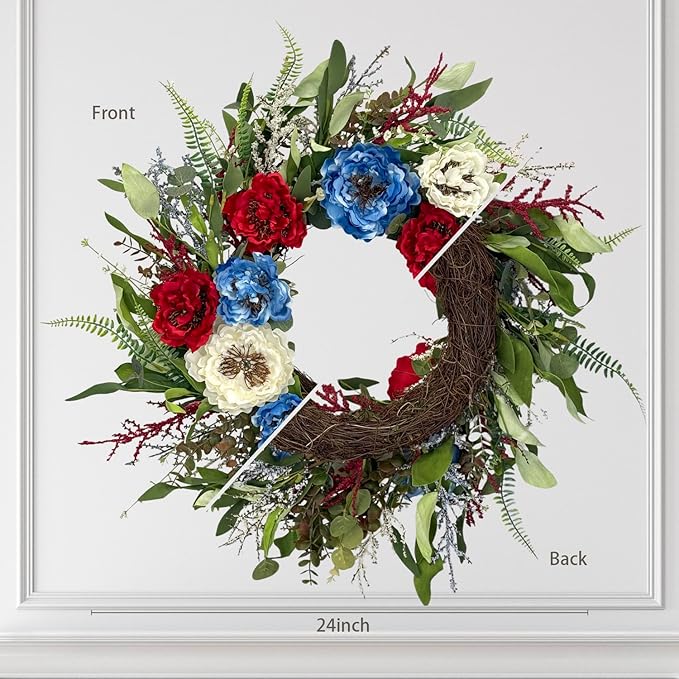 24 Inch Patriotic Wreaths for Front Door, 4th of July Wreaths for Front Door, Peony Eucalyptus Patriotic Summer Flag Wreath Handcrafted Memorial Day Artificial Flowers Wreath for Indoor and Outdoor