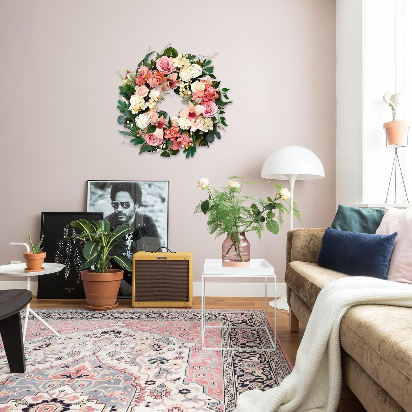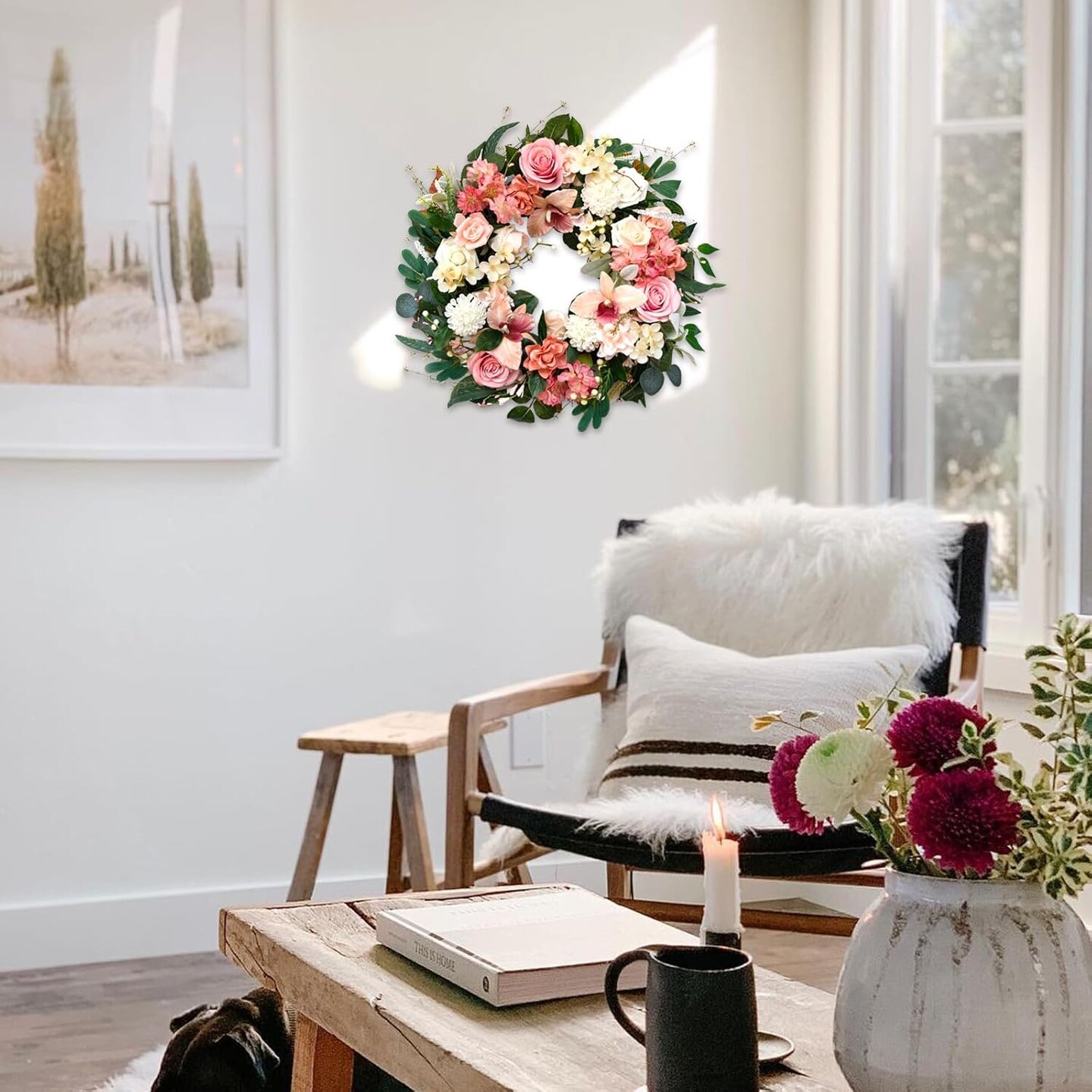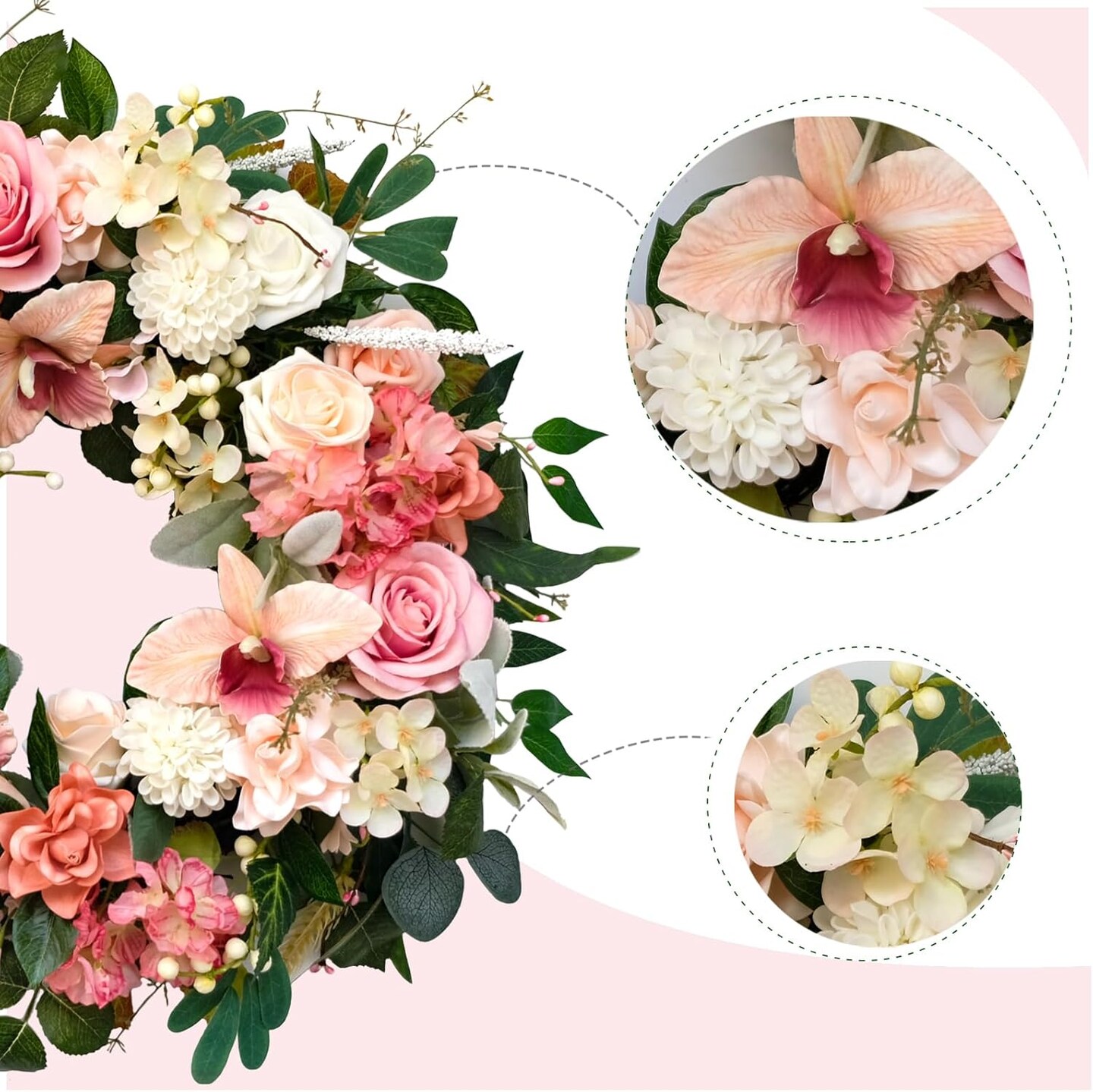 24 Inch Summer Everyday Flower Wreath for Front Door, Soft Touch Pink Roses Orchid Peony Floral for Indoor Outdoor, Flower Wreath for Home Decoration