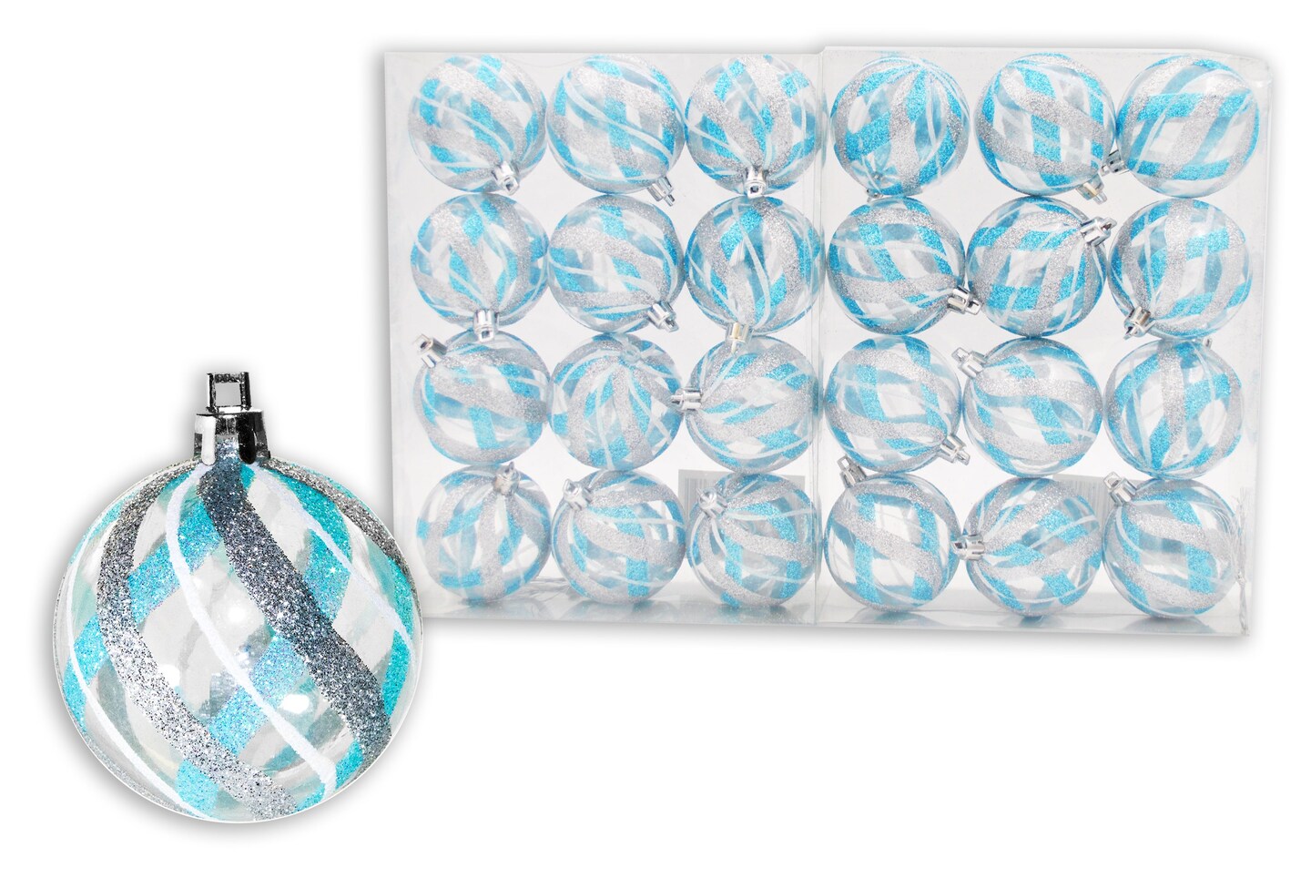 24 Pack Clear Ball Ornament with Aqua, Silver and White Swirls Design