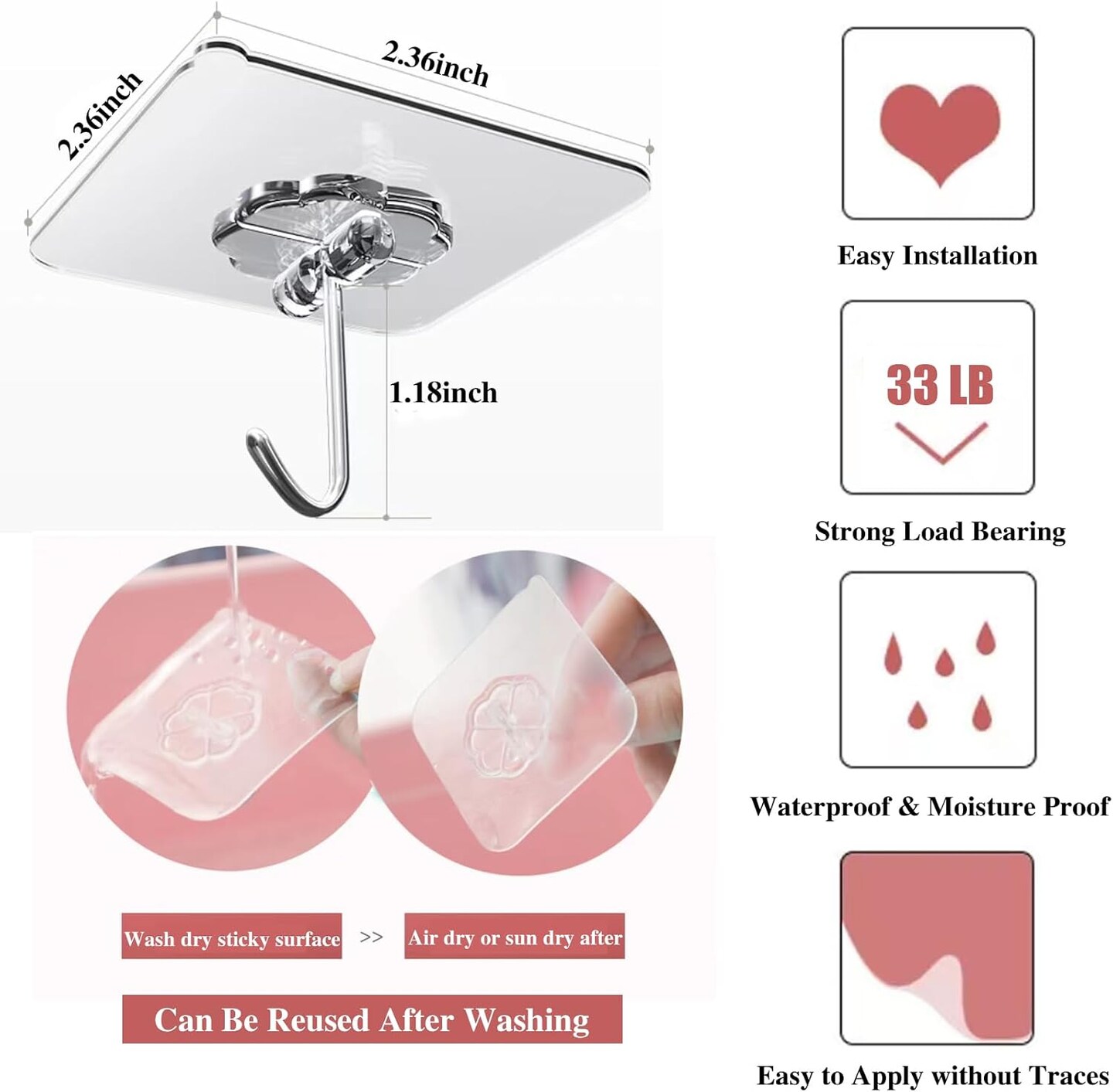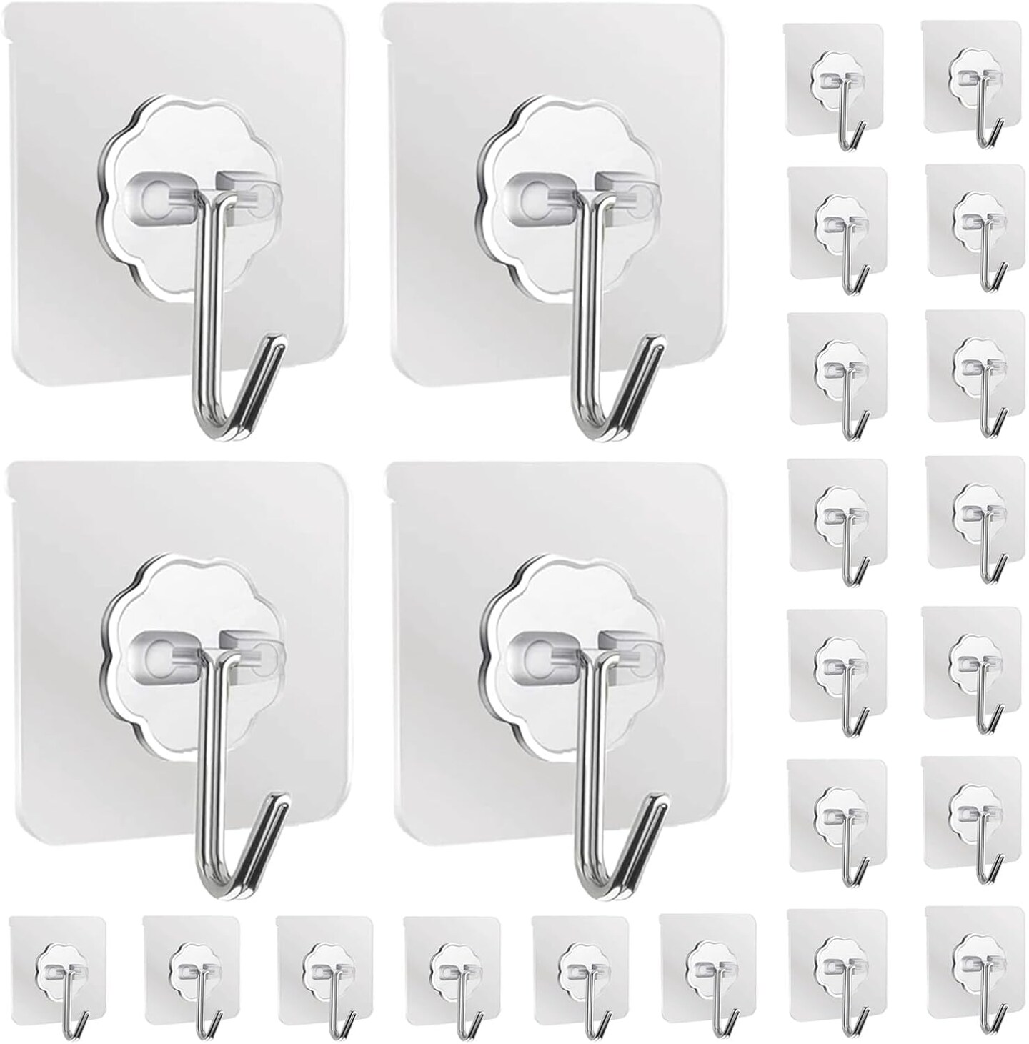 24 Pack Wall Hooks 33lb(Max) Transparent Reusable Hook(Transparent, Silver)