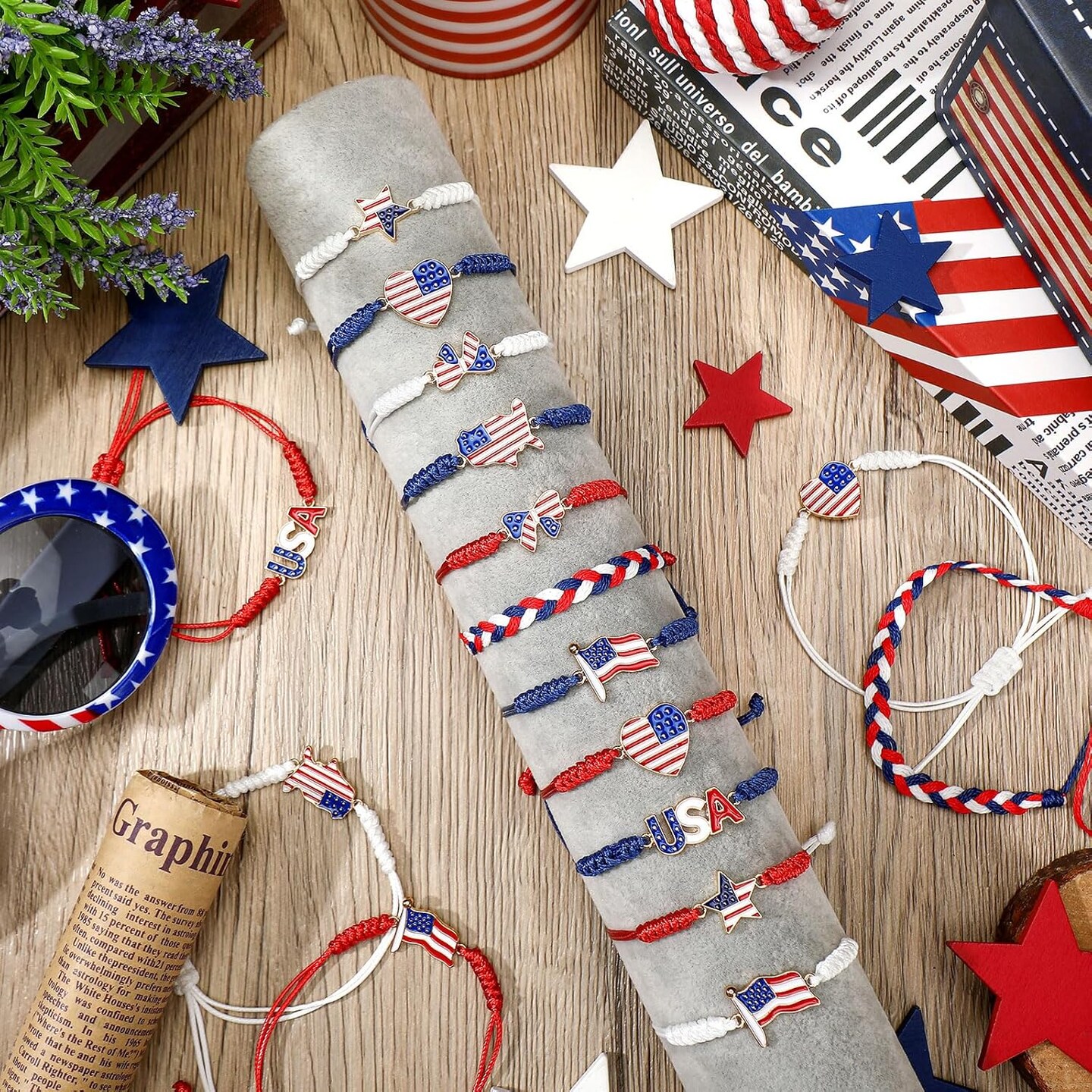 24 Pcs 4th of July Bracelets Red White and Blue USA Star American Flag String Woven Bracelets Bulk decorations for Patriotic Independence Day Party Favors
