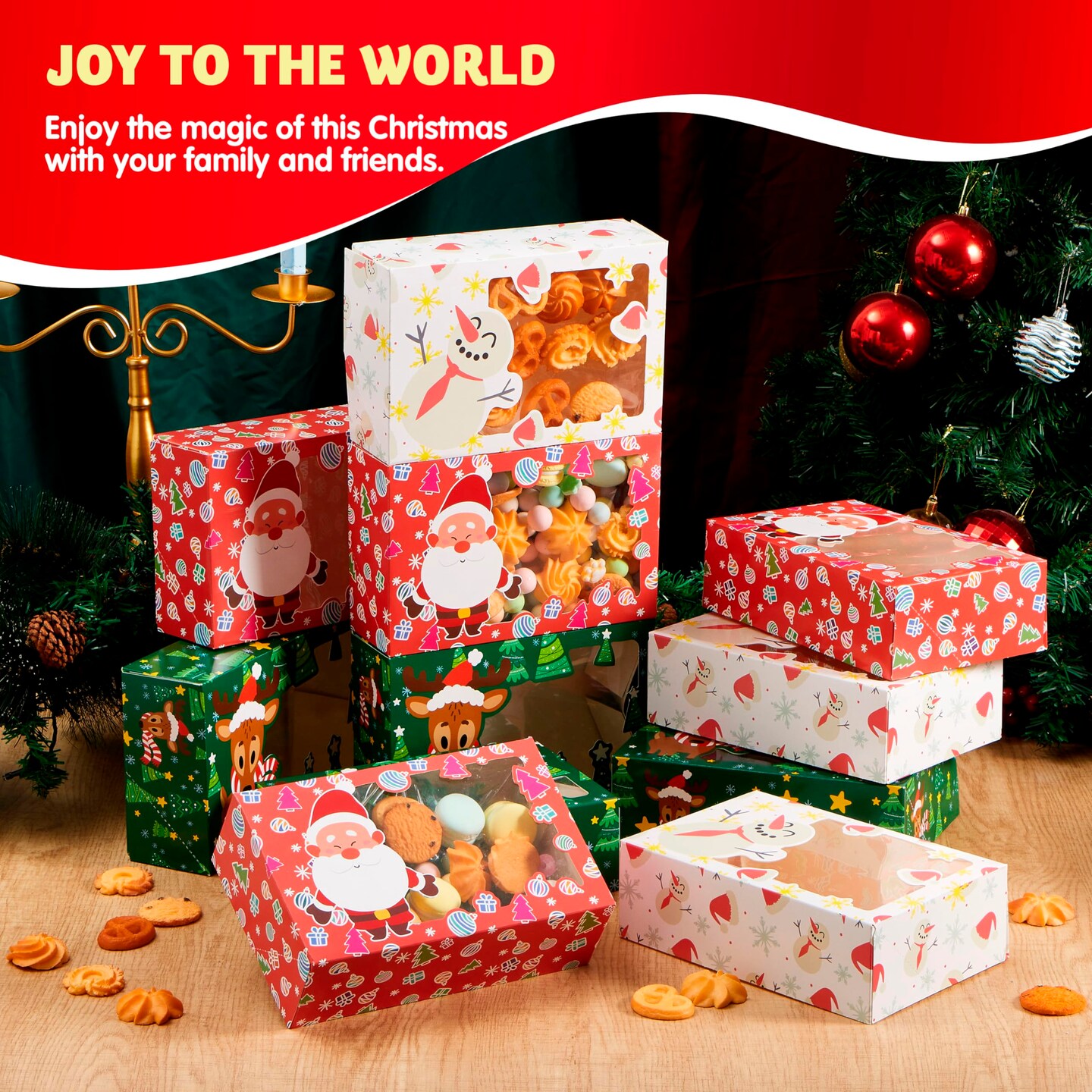 24 PCS Christmas Foil Treats Cookie Gift Boxes (8.75" x 5.75" x 2.75") Colorful Pattern Bakery Box with Window for Xmas Holiday Birthday Party Pastries, Cupcakes, Brownies, Donuts Gift-Giving