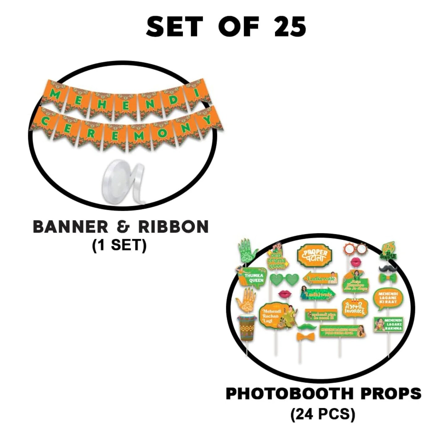 24 Pcs Mehendi Photo Booth Party Props & 1 Pcs Mehndi Ceremony Banner Wedding Photoshoot Mehandi Decoration Marriage Props for Bride and Family