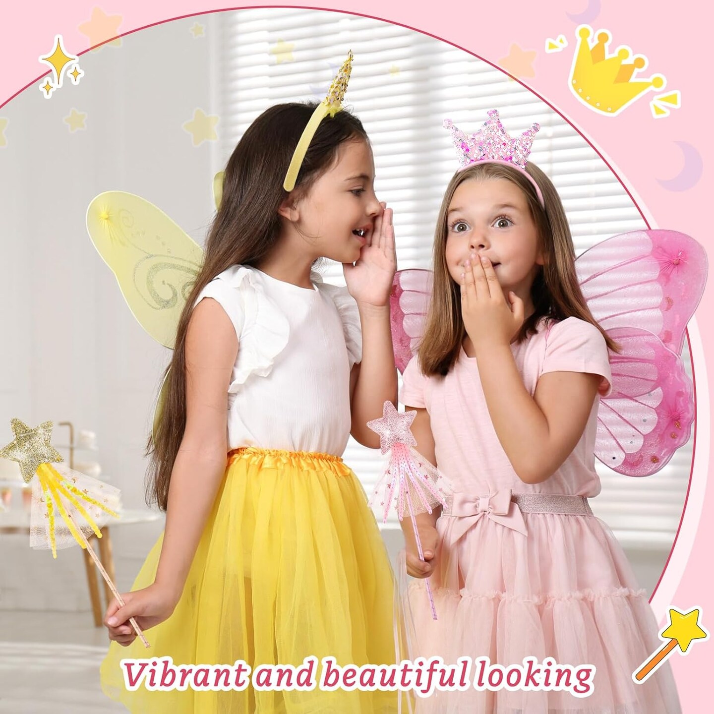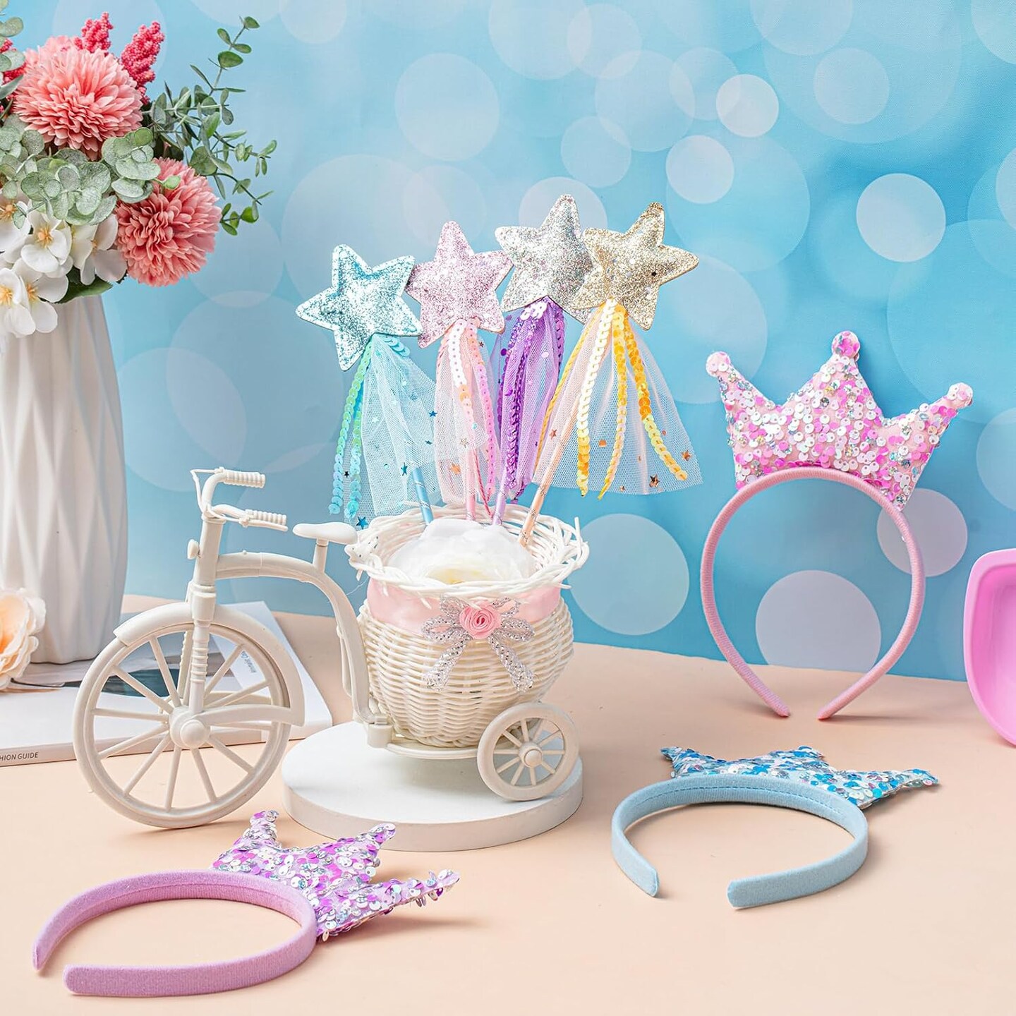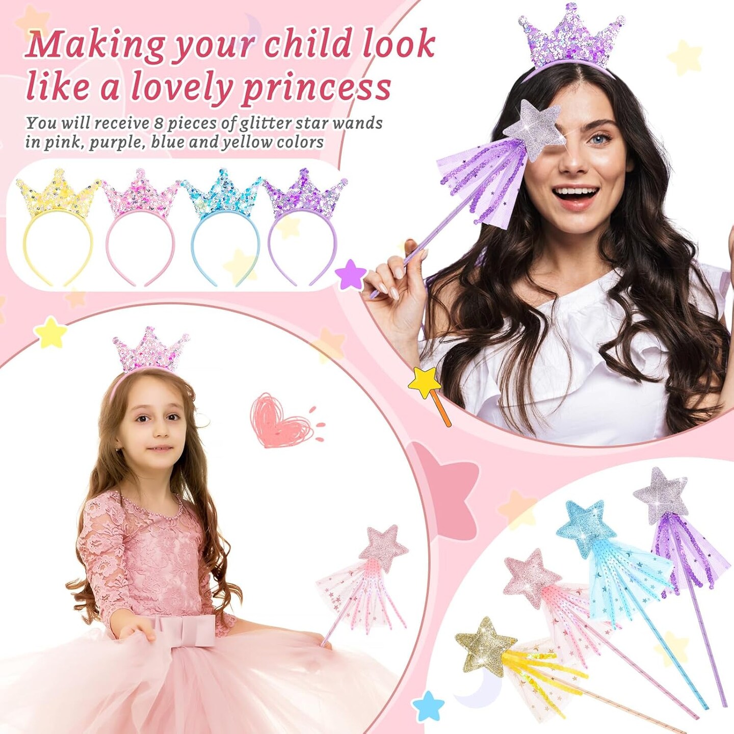 24 Pcs Princess Wands Party Favors Glitter Star Fairy Wands Sequin Princess Crown Headbands for Girls Birthday Party Gifts