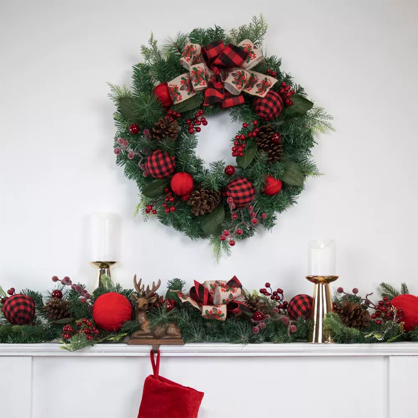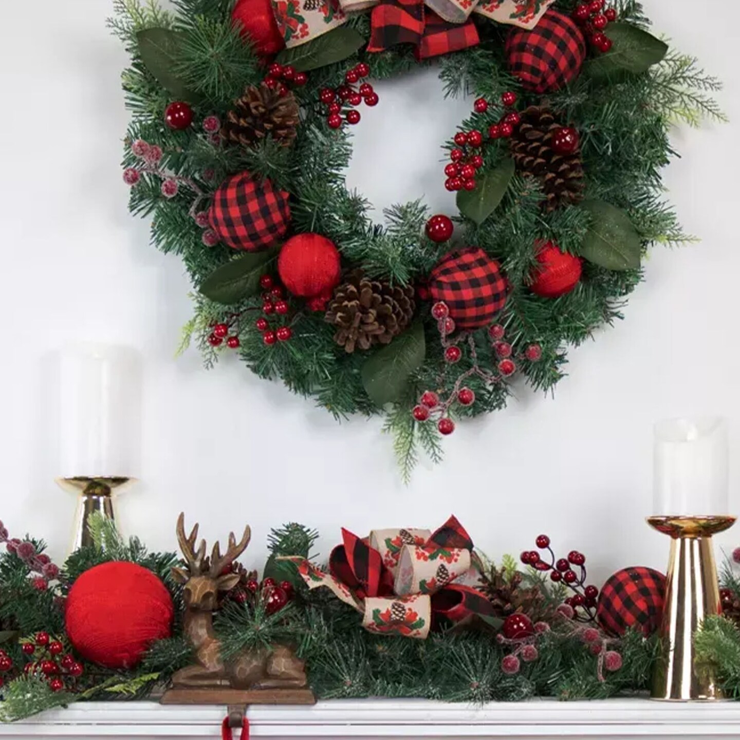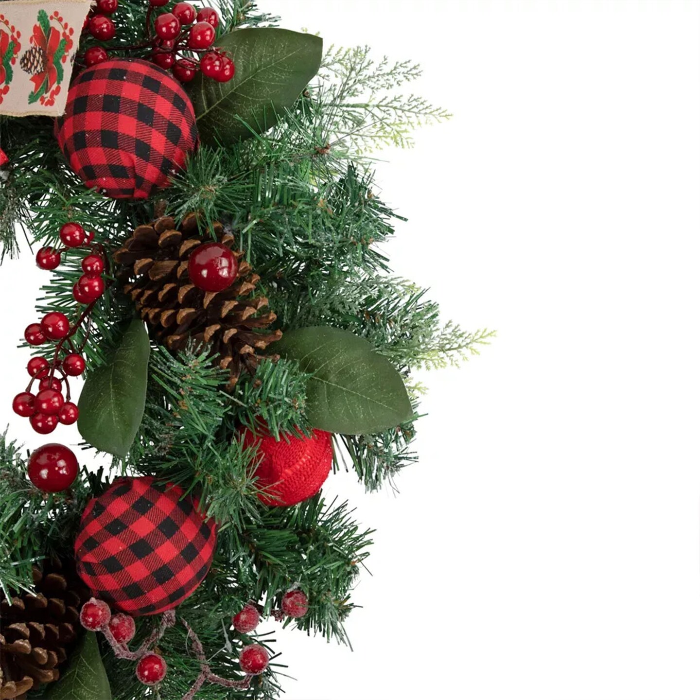 24" Pine Christmas Wreath with Bows & Plaid Ornaments