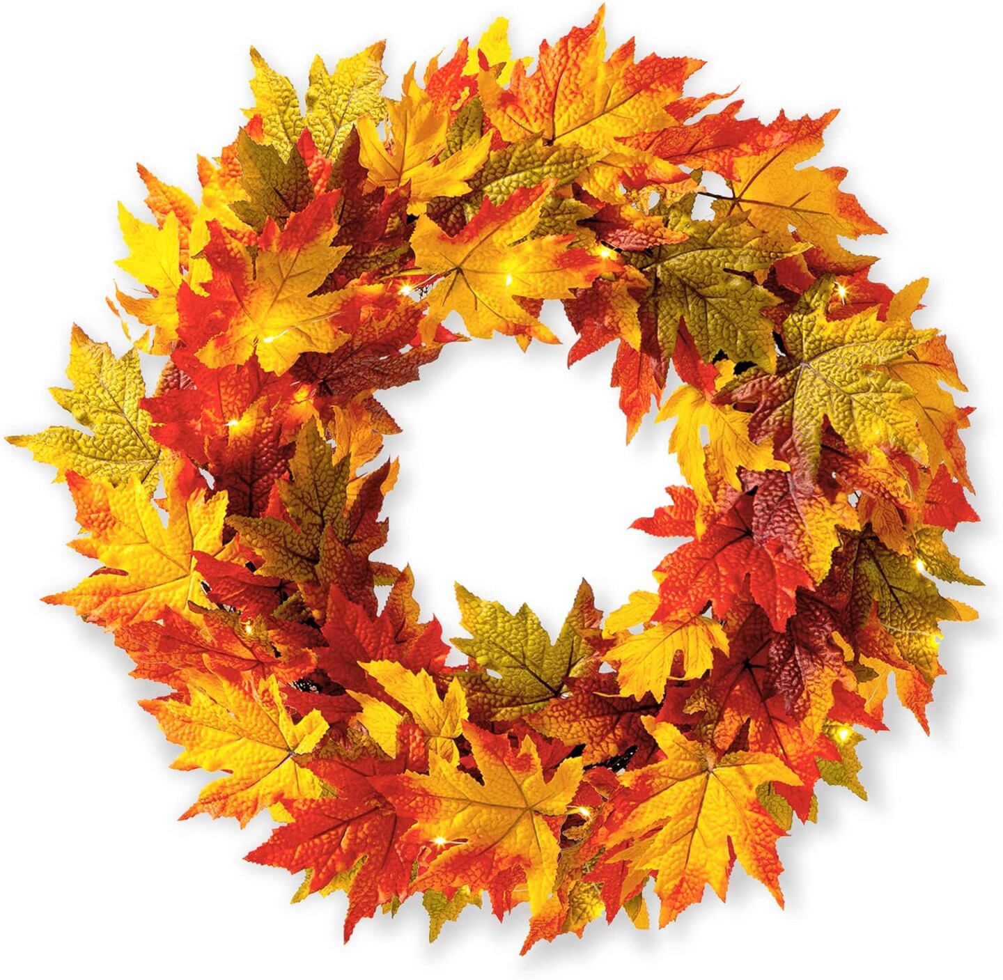 24" Pre-lit Fall Maple Leaves Wreath with Timer, Artifical Fall Wreath with LED Lights