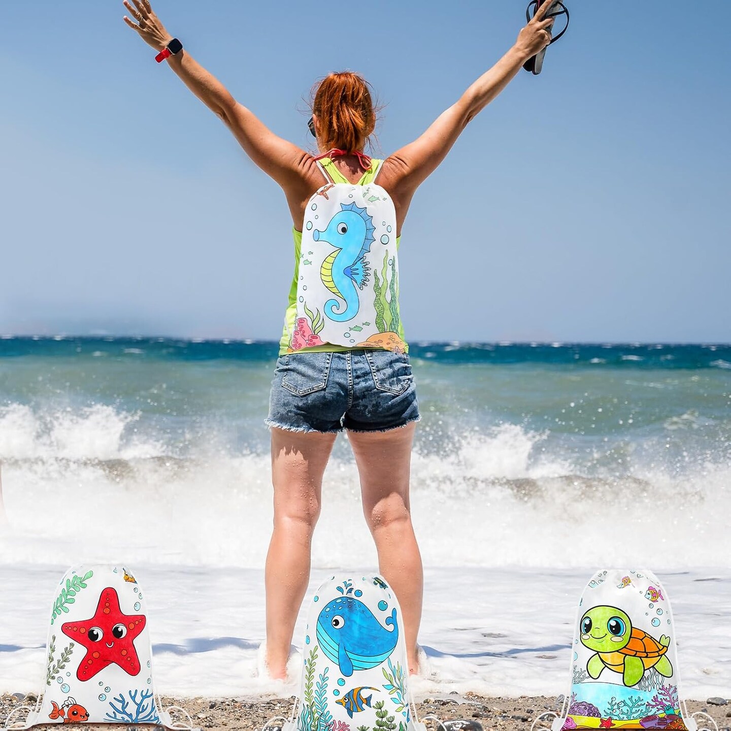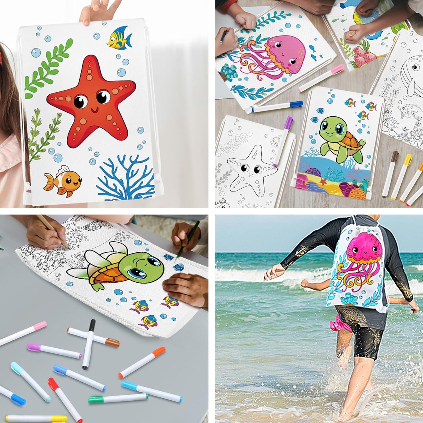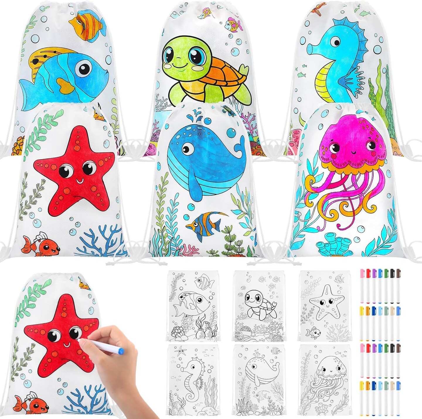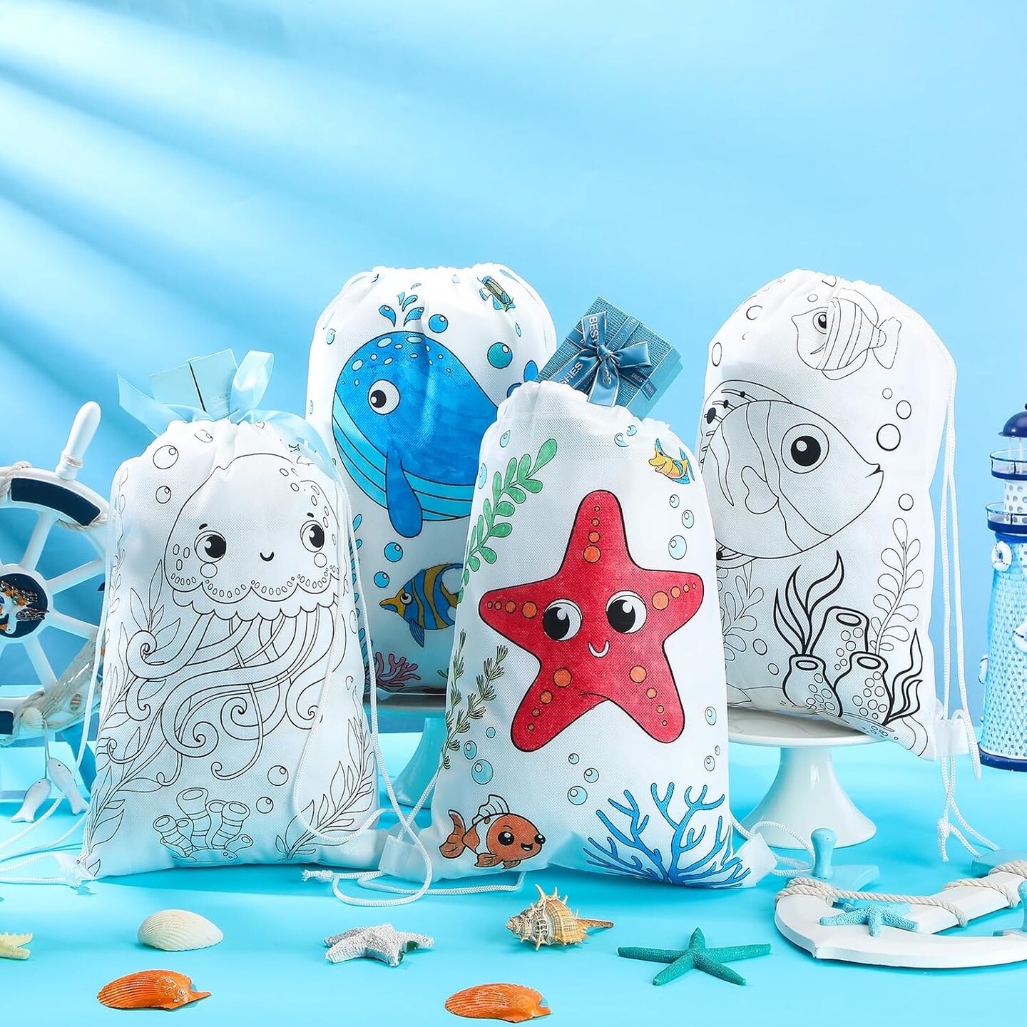 24 Set Under The Sea Coloring Drawstring Bags DIY Summer Color Your Own Non Woven Sea Animals Goodie Bags with Coloring Markers