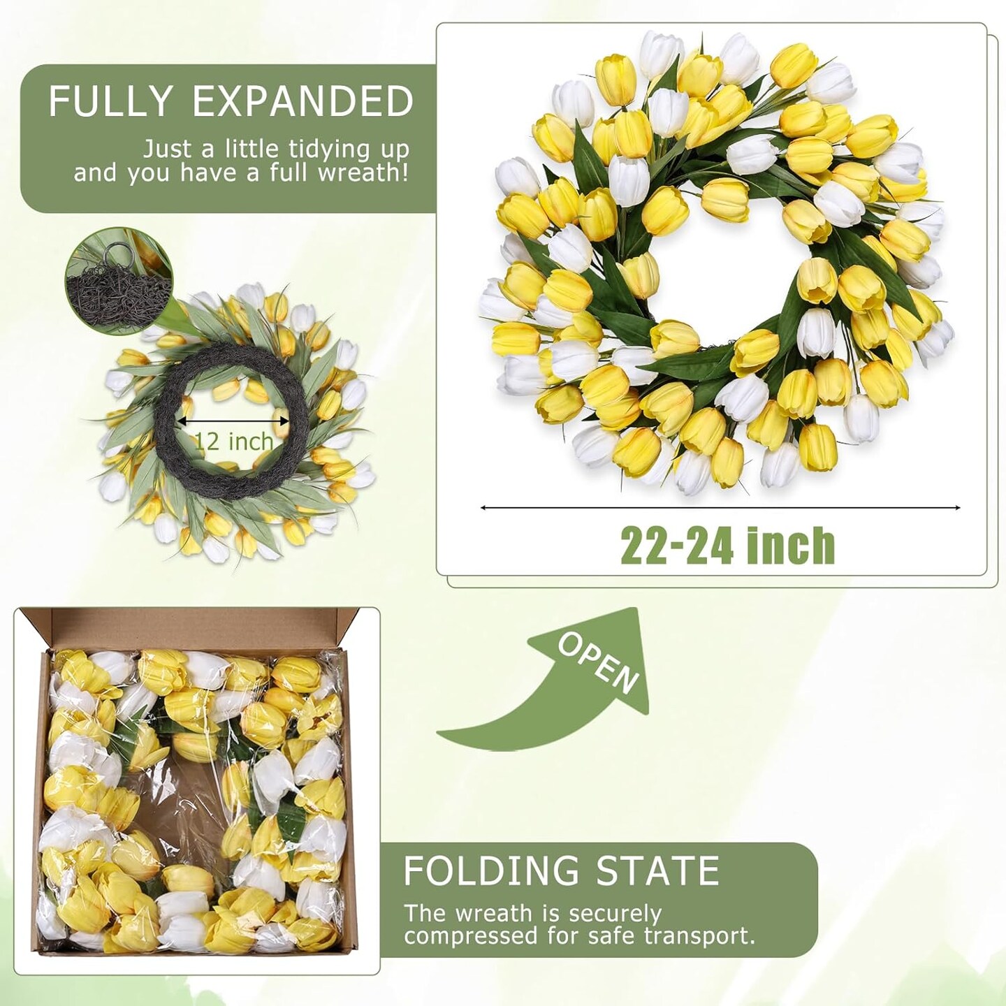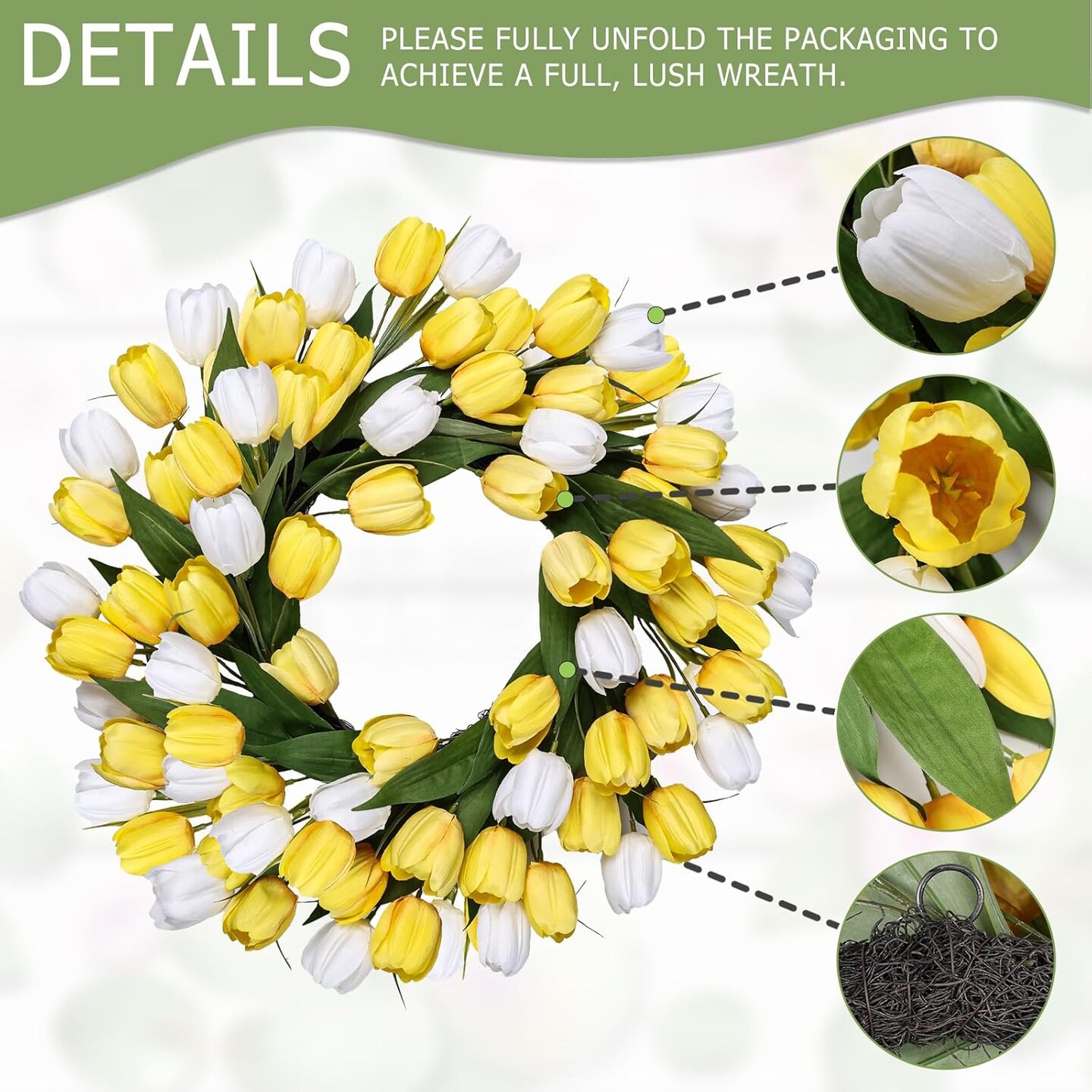 24" Yellow Tulip Spring Wreath – Silk Front Door Wreath with Green Leaves, All-Season Farmhouse Porch, Wall, Living Room & Wedding Decor