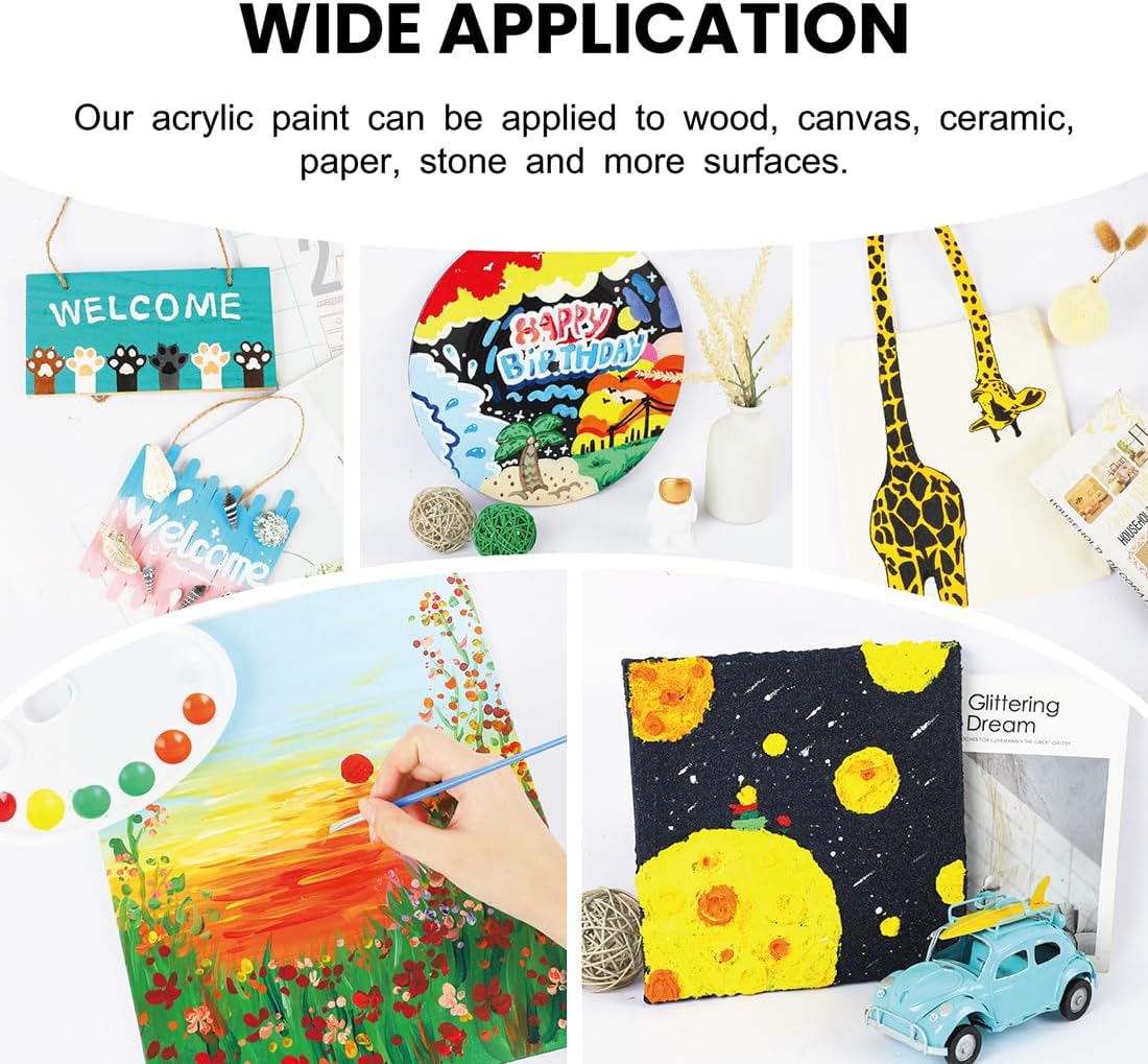 24-Color Acrylic Paint Set – 36ml Tubes, 10 Brushes, Rich Pigment for Canvas, Wood, Fabric, and Crafts.