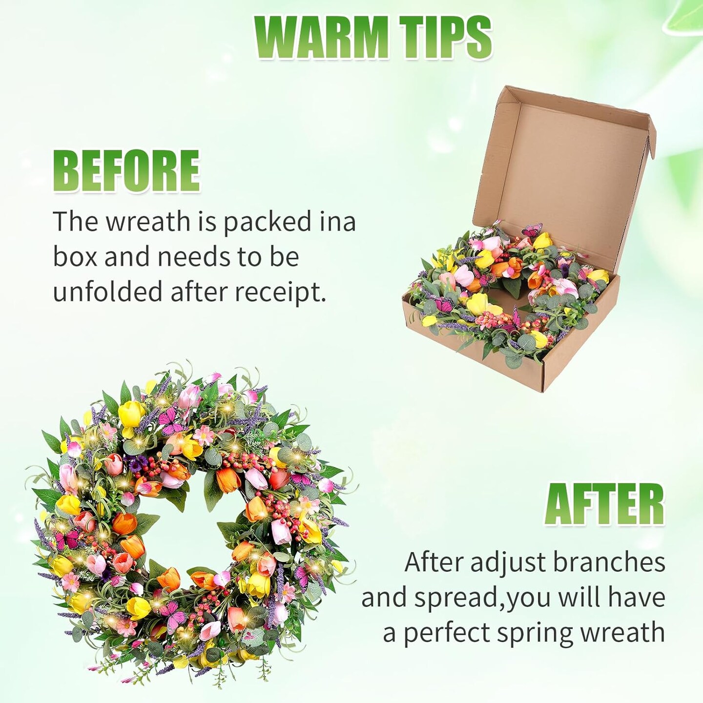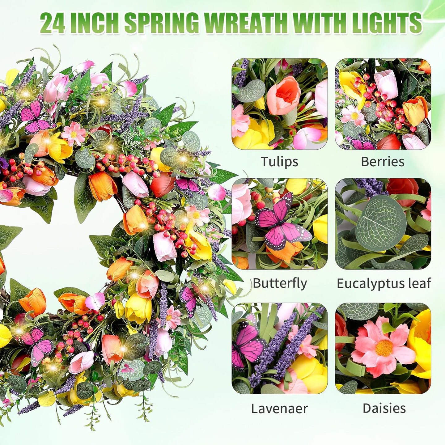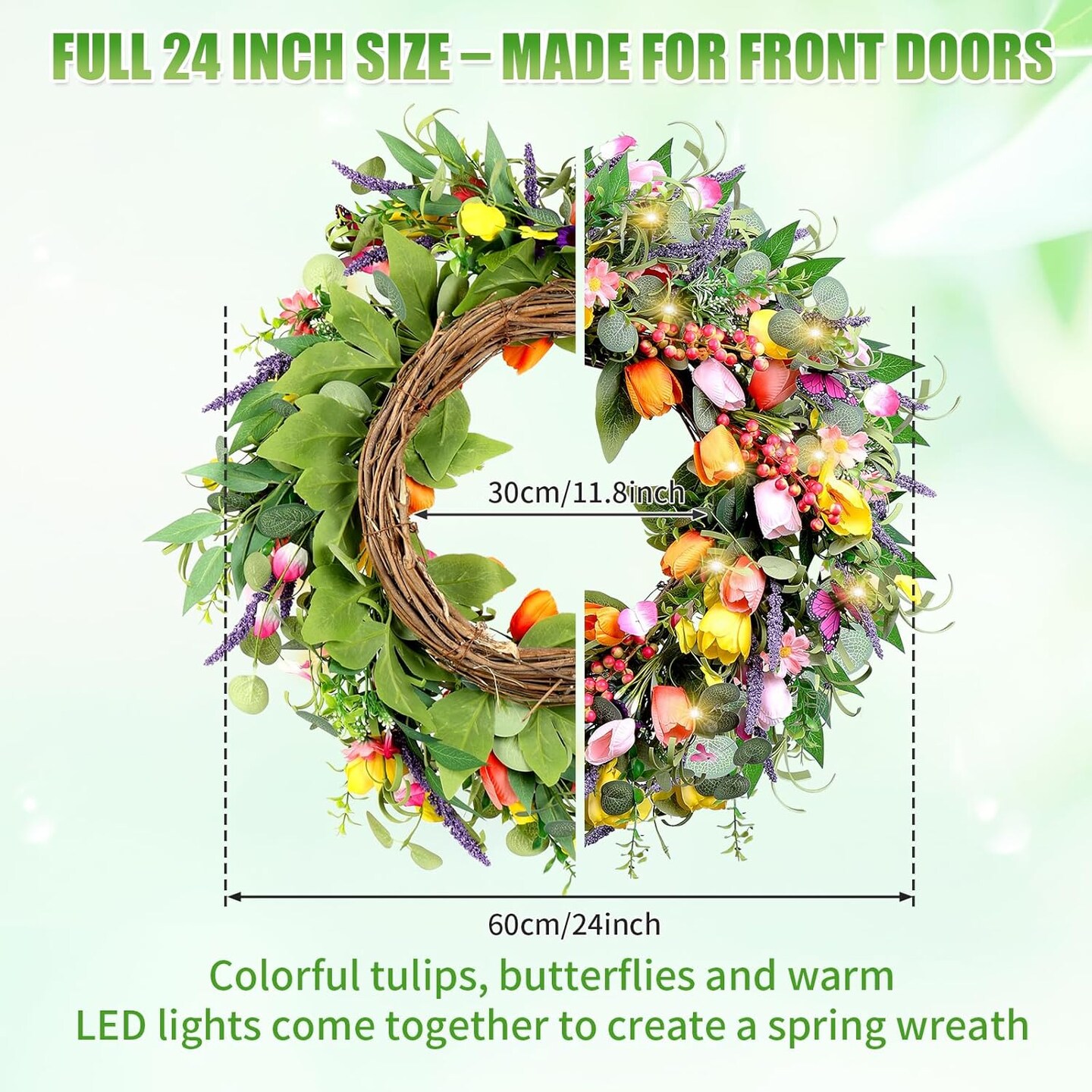 24-Inch Spring Tulip Wreath with LED Lights & Butterflies – Artificial Floral Front Door Wreath for Spring, Summer, Easter, Indoor & Covered Outdoor Décor