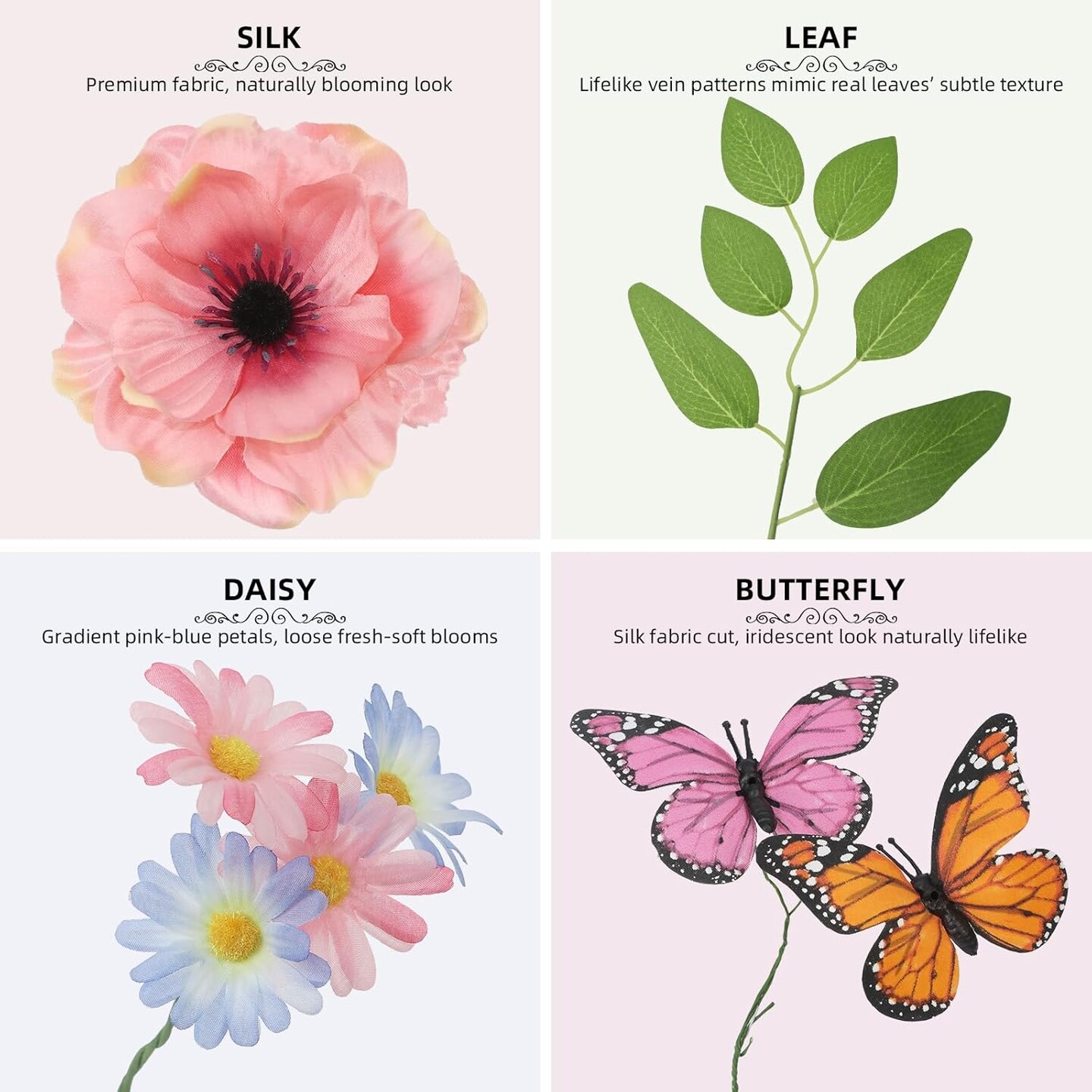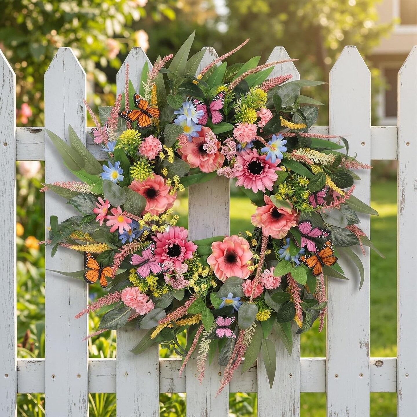 24-Inch Spring Wreath for Front Door – Handcrafted Floral Wreath with Eucalyptus, Pink Flowers & Butterfly, Farmhouse Indoor Outdoor Home Decor