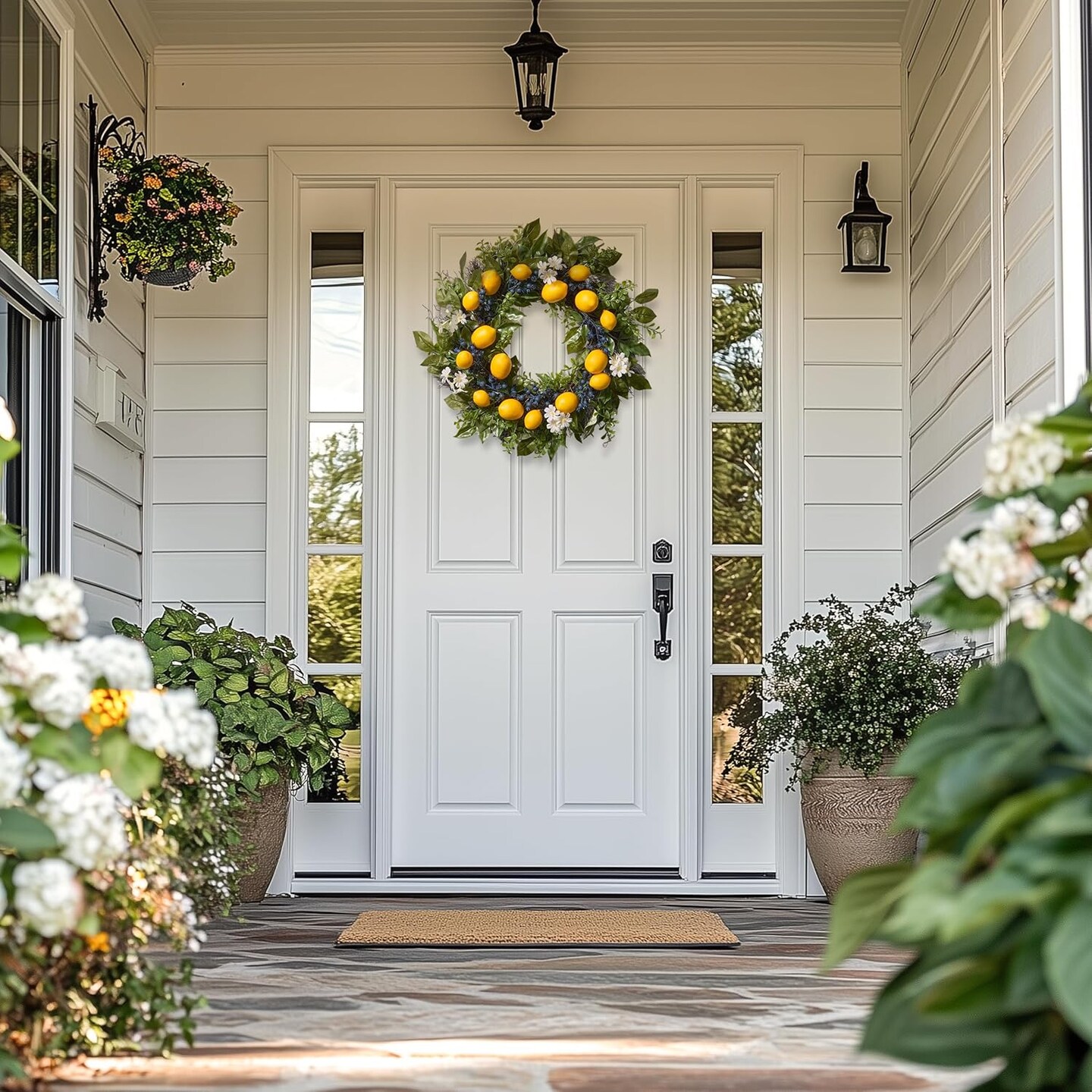 24-Inch Summer Artificial Lemon Wreath with Lights – Front Door or Wall Décor with Eucalyptus Leaves and Blueberries for Farmhouse, Home, Kitchen, and Party Decorations