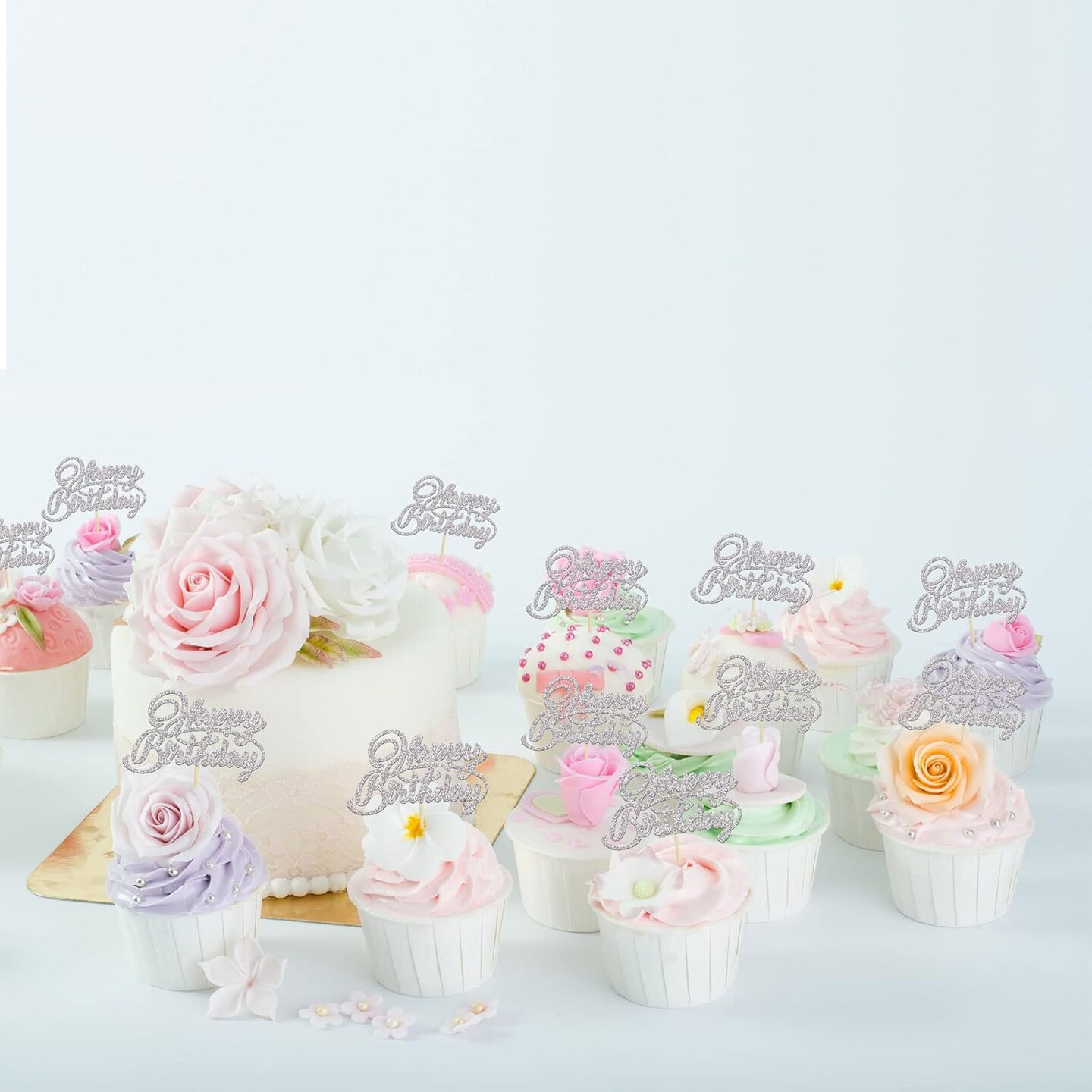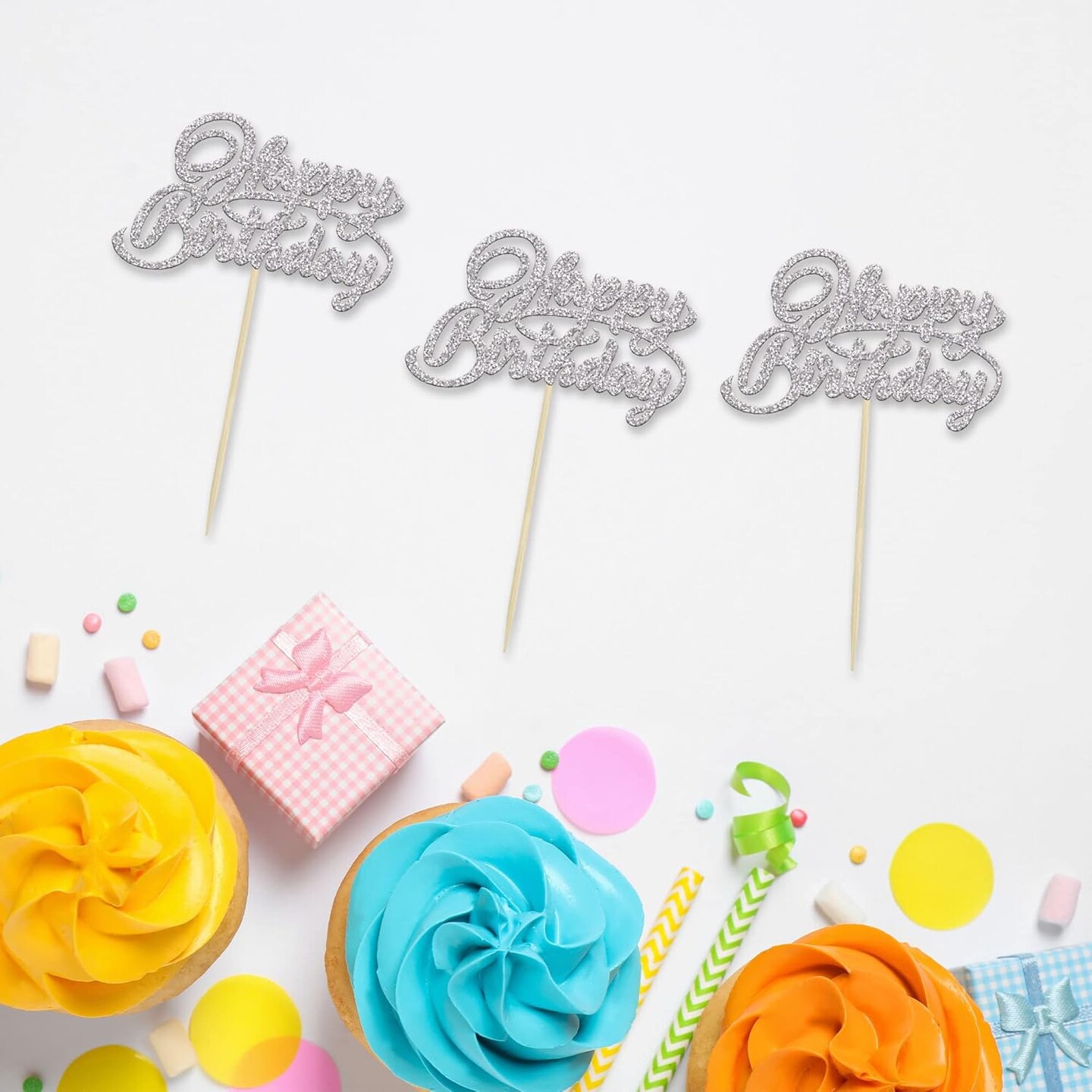 24PCS Happy Birthday Cupcake Toppers – Glitter Silver Picks, 2.6"x4.3" for Party Cakes