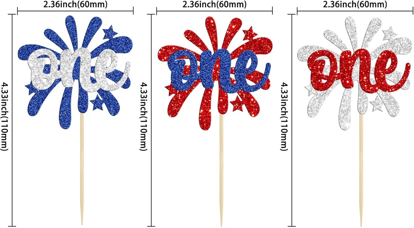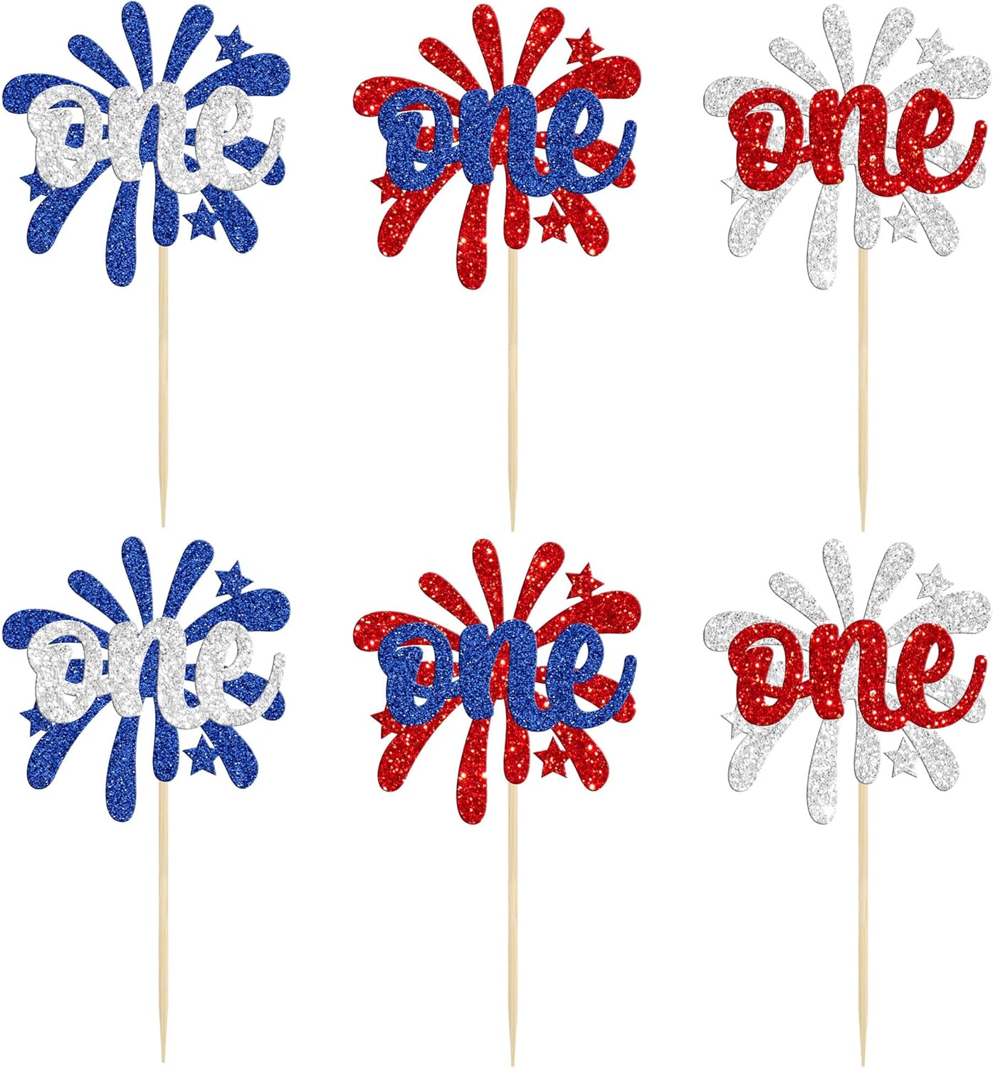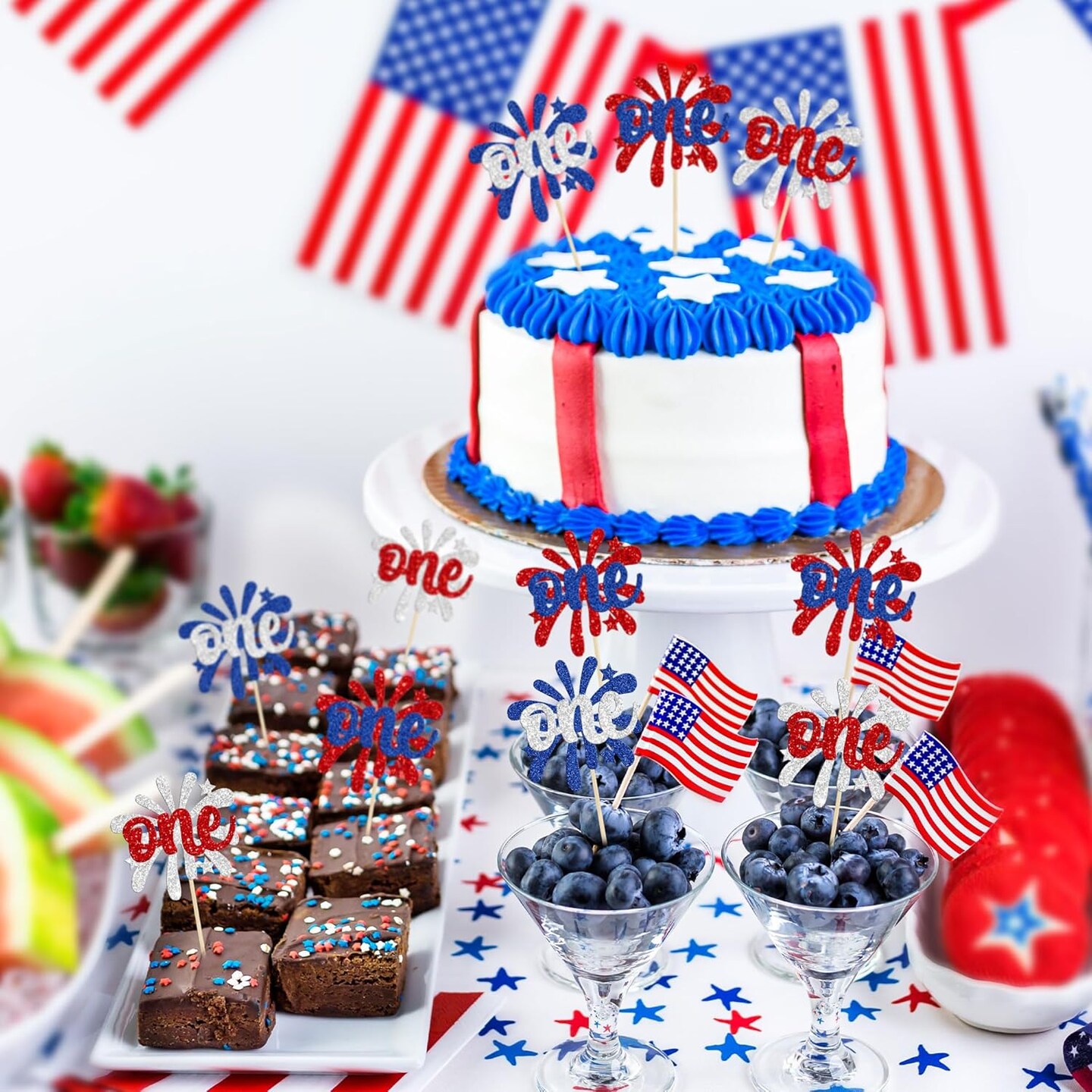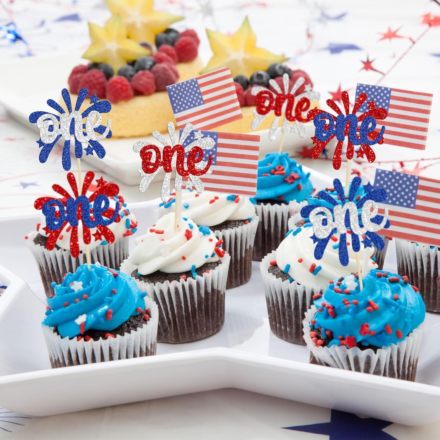 24Pcs Patriotic One Cupcake Toppers Firework First Birthday Cupcake Picks for Happy 4th of July American National Independence Day Theme 1st Birthday Party Cake Decorations Supplies