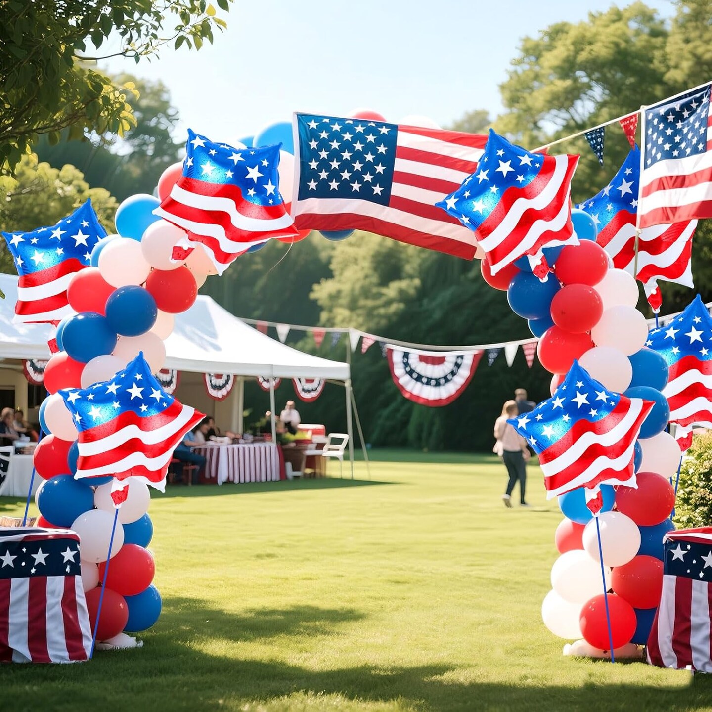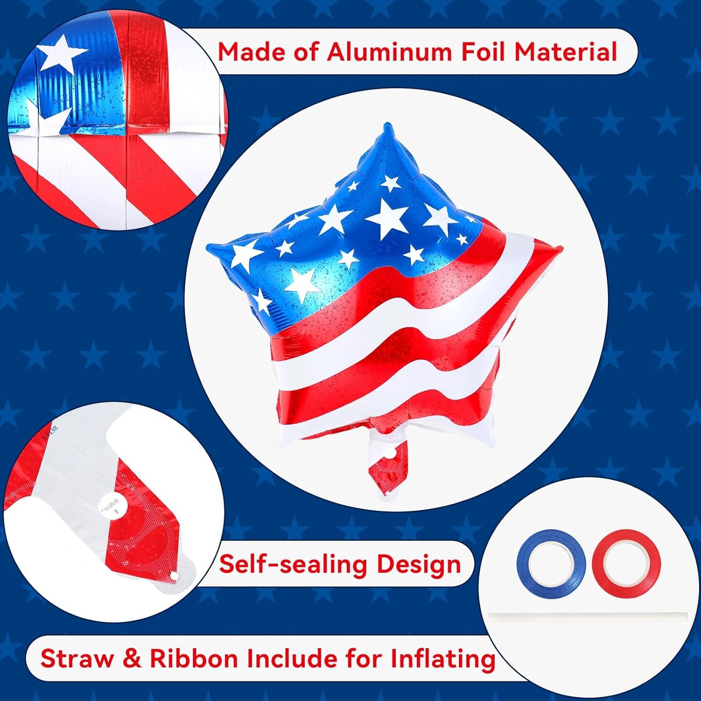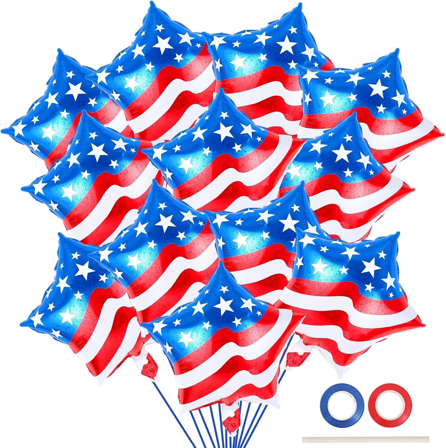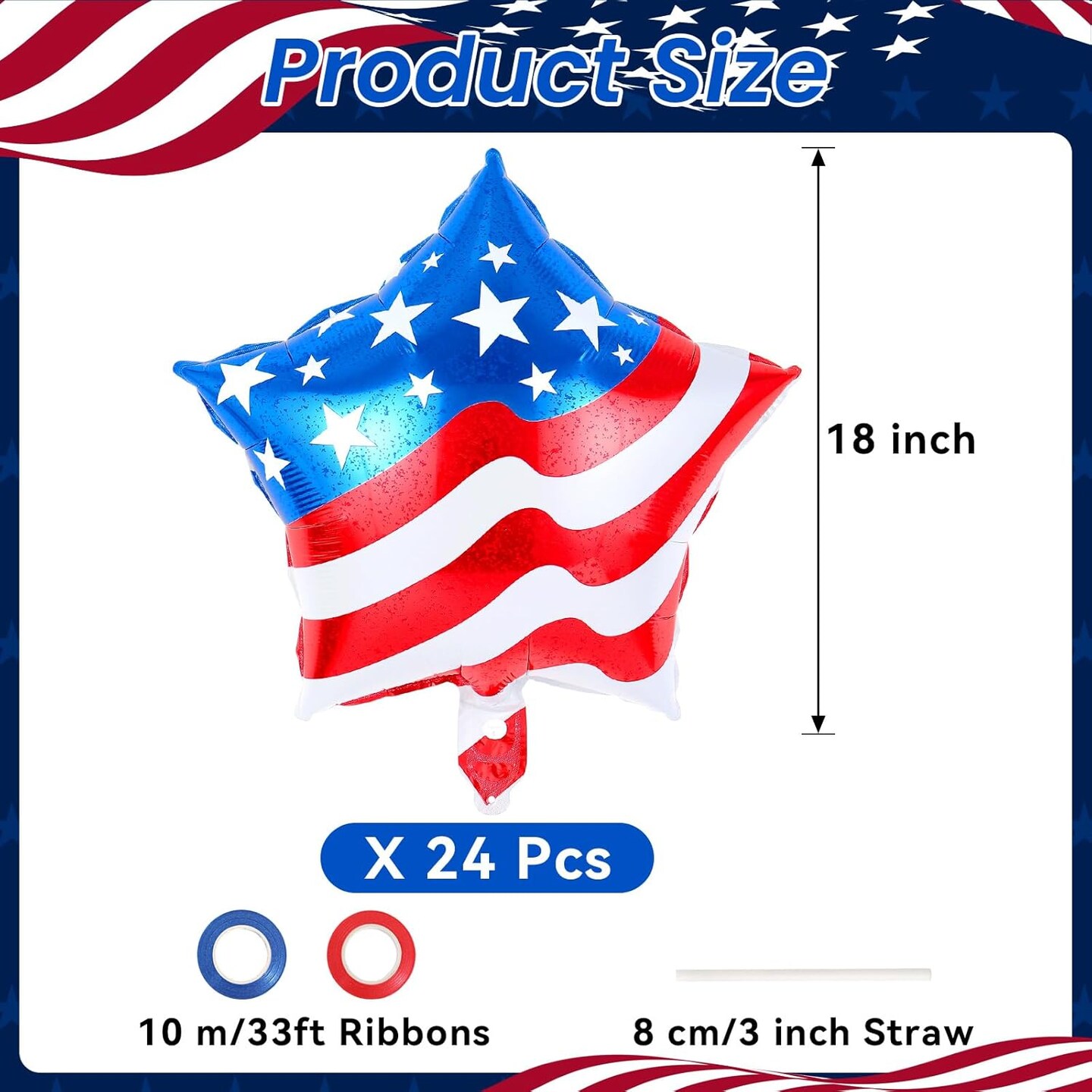 24-Piece 4th of July Balloons – 18-Inch American Flag Star Foil Balloons with Ribbons & Straw for Independence Day, Memorial Day & Patriotic Party Decorations