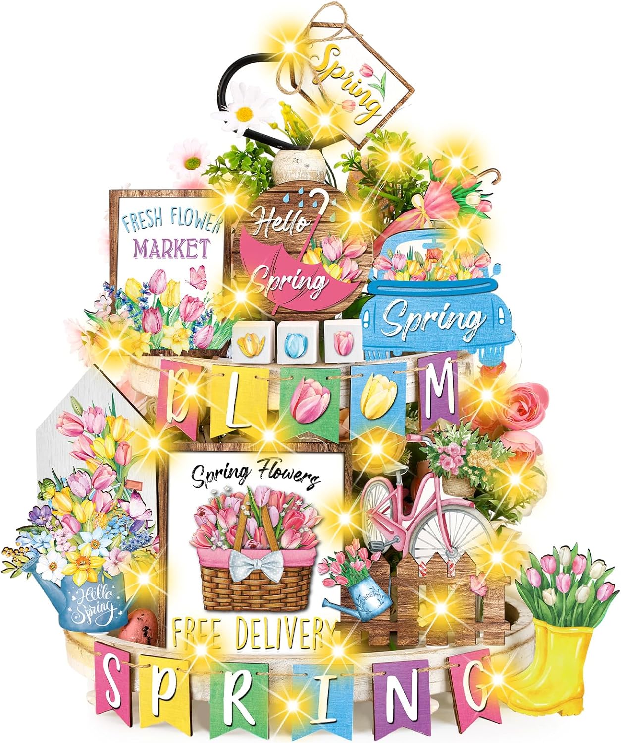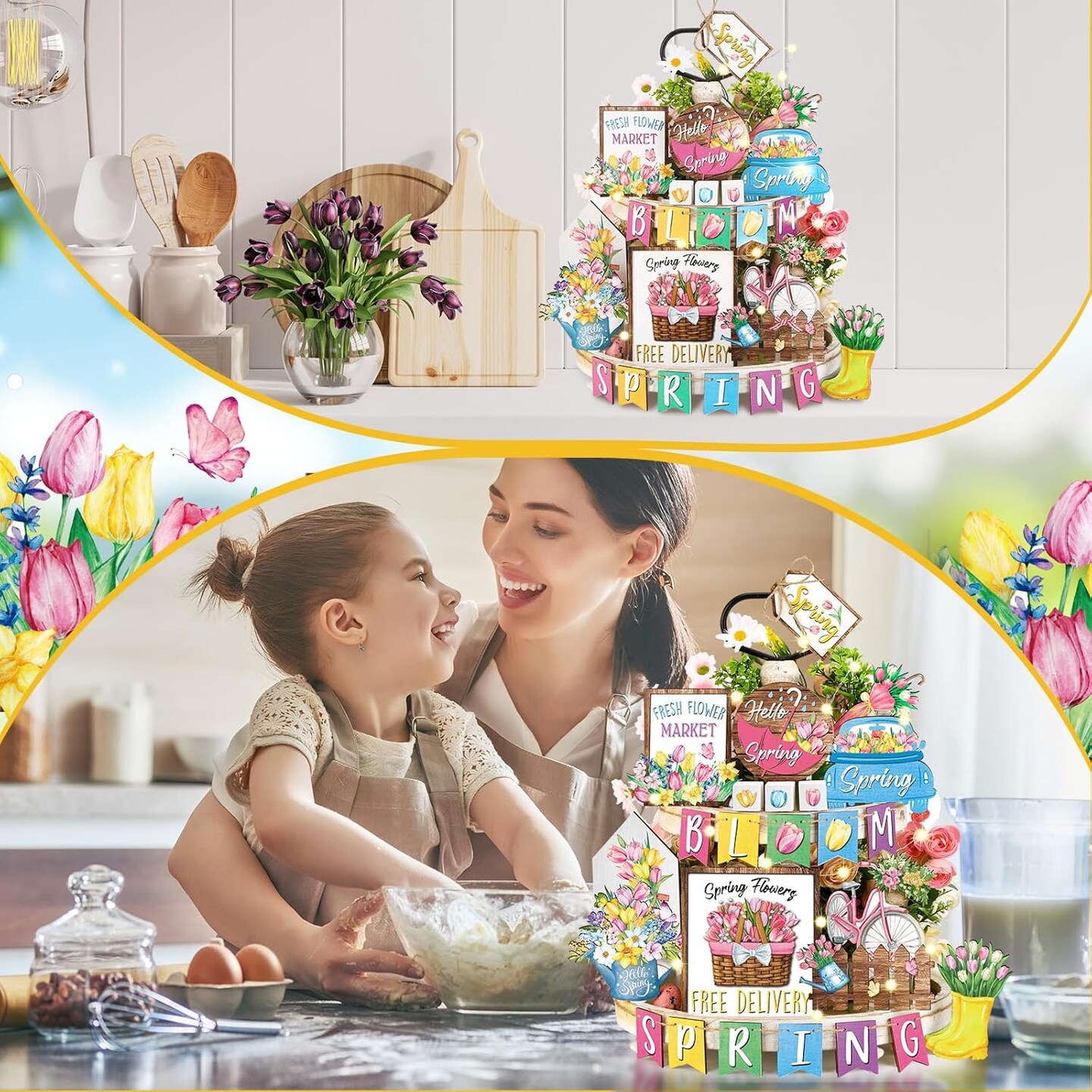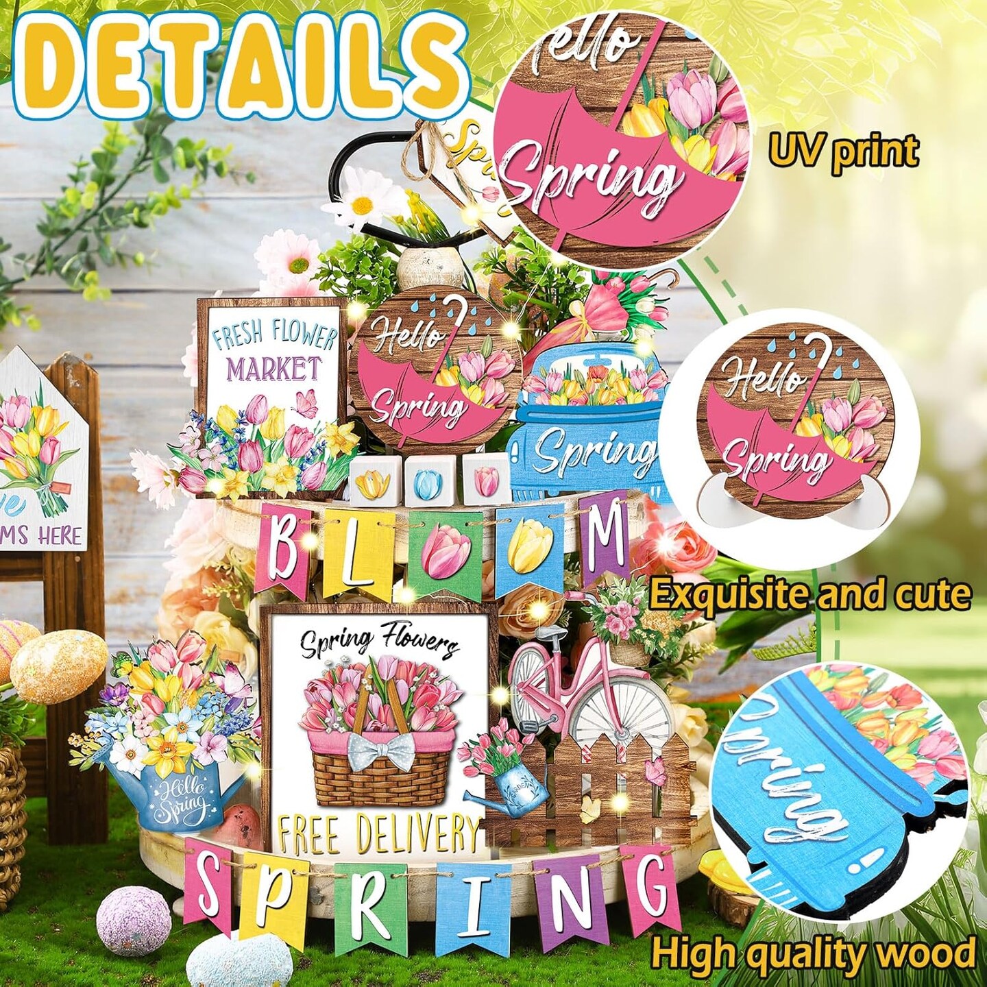 24-Piece Spring Tiered Tray Decor Set – Wooden Table Centerpieces & Farmhouse Bloom Blocks for Home & Office