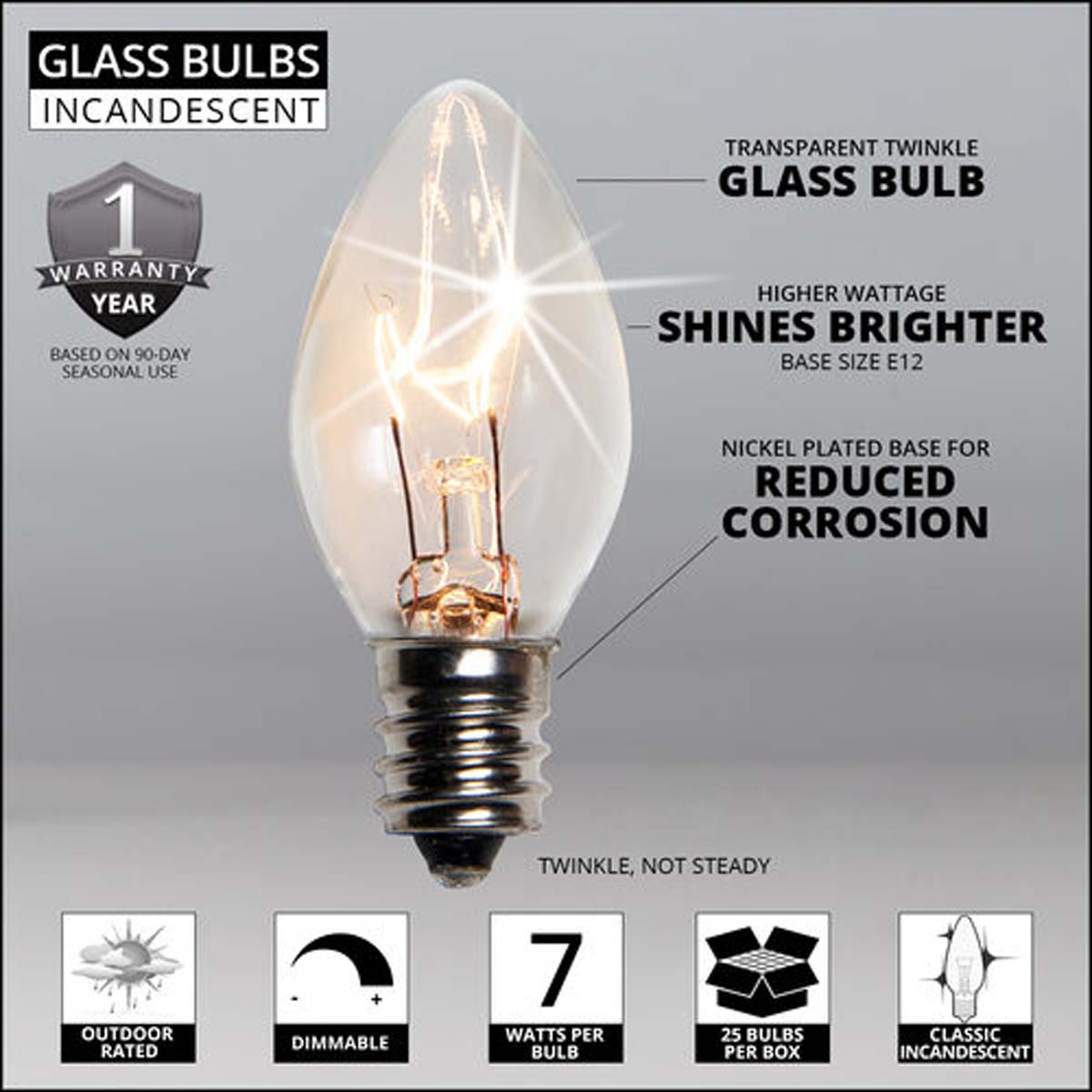 25 Bulbs - C7 Twinkle Transparent Clear, 7 Watt lamp