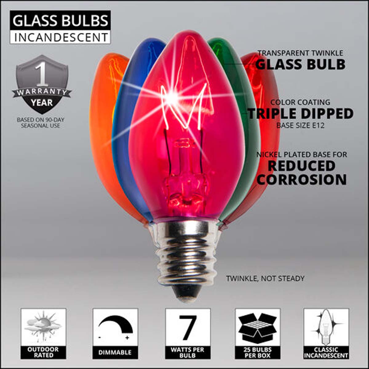 25 Bulbs - C7 Twinkle Triple Dipped Transparent Multicolor, 7 Watt lamp