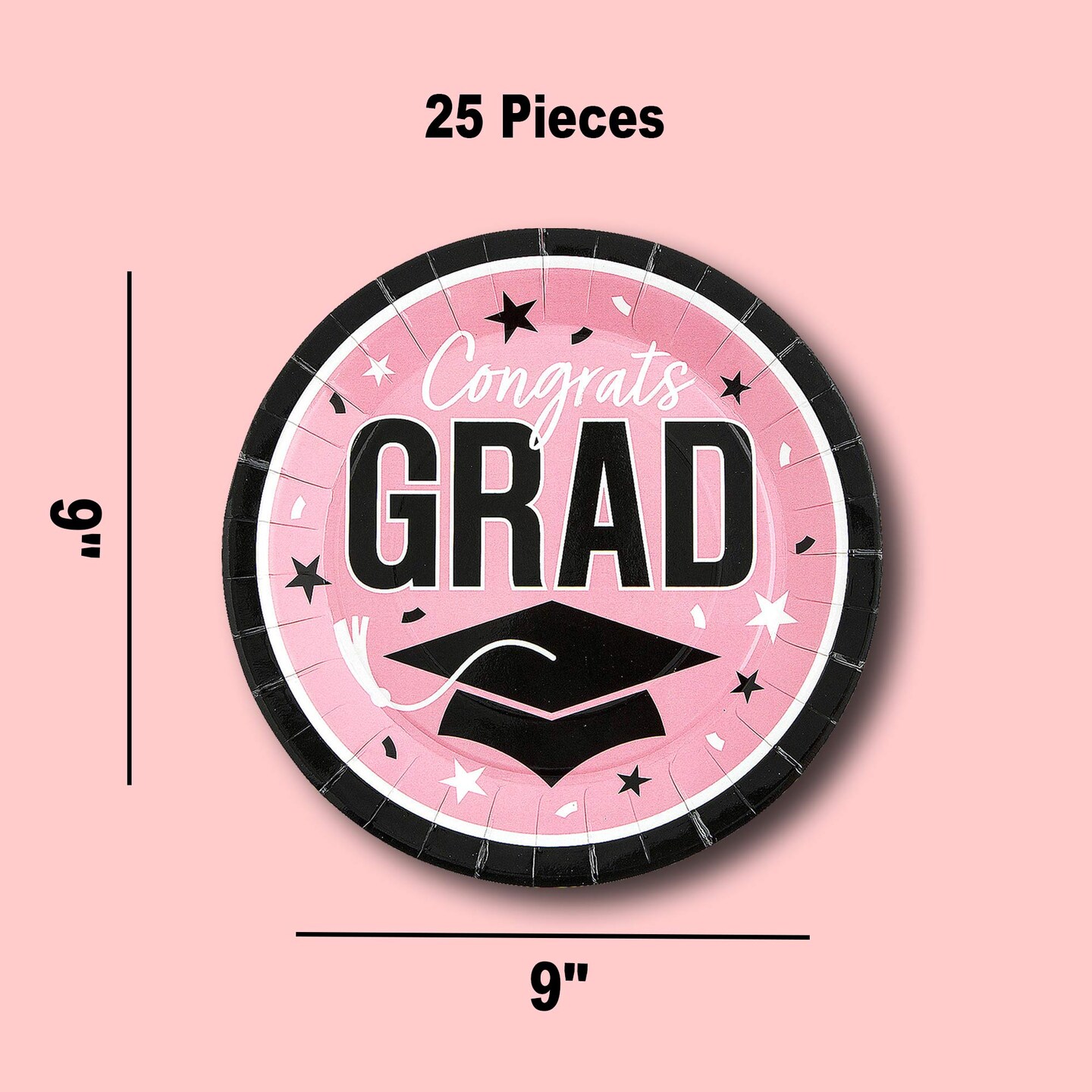 25 Count Pink Congrats Grad Paper Plates 9 Inch Round for Graduation Party Supplies