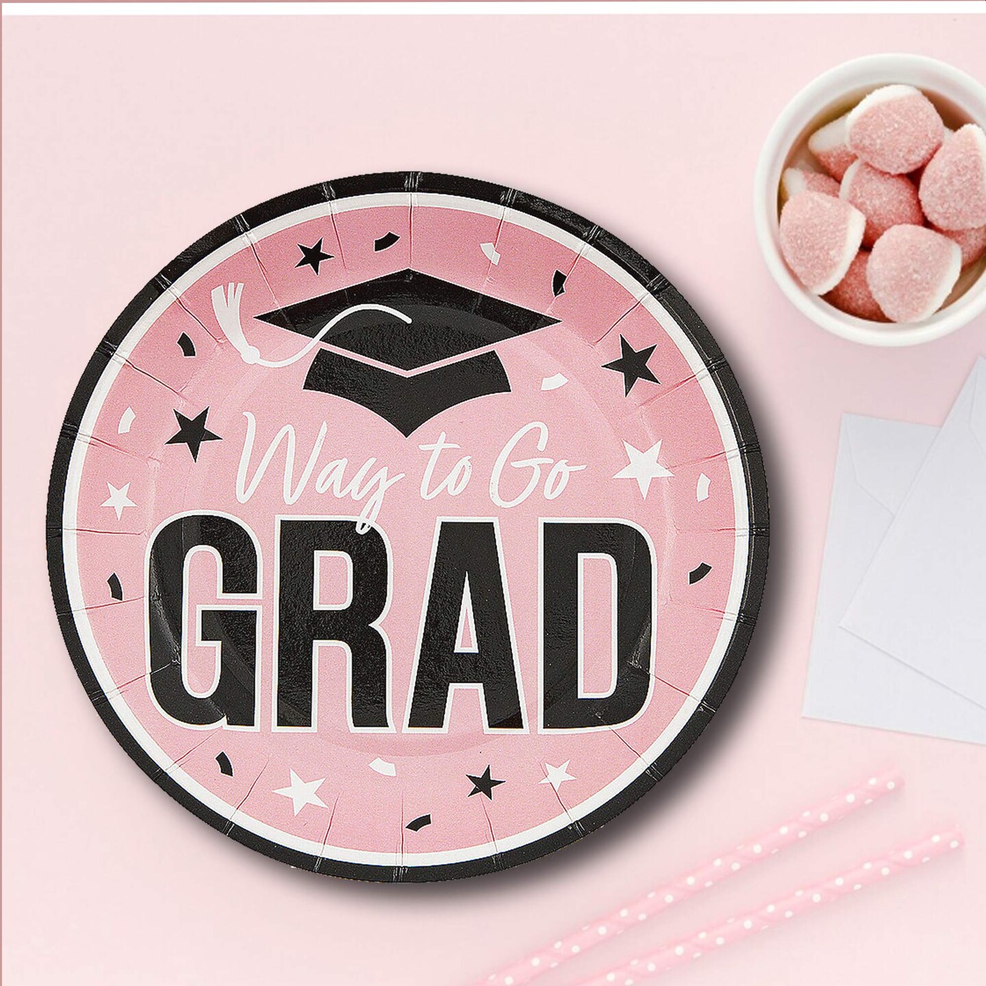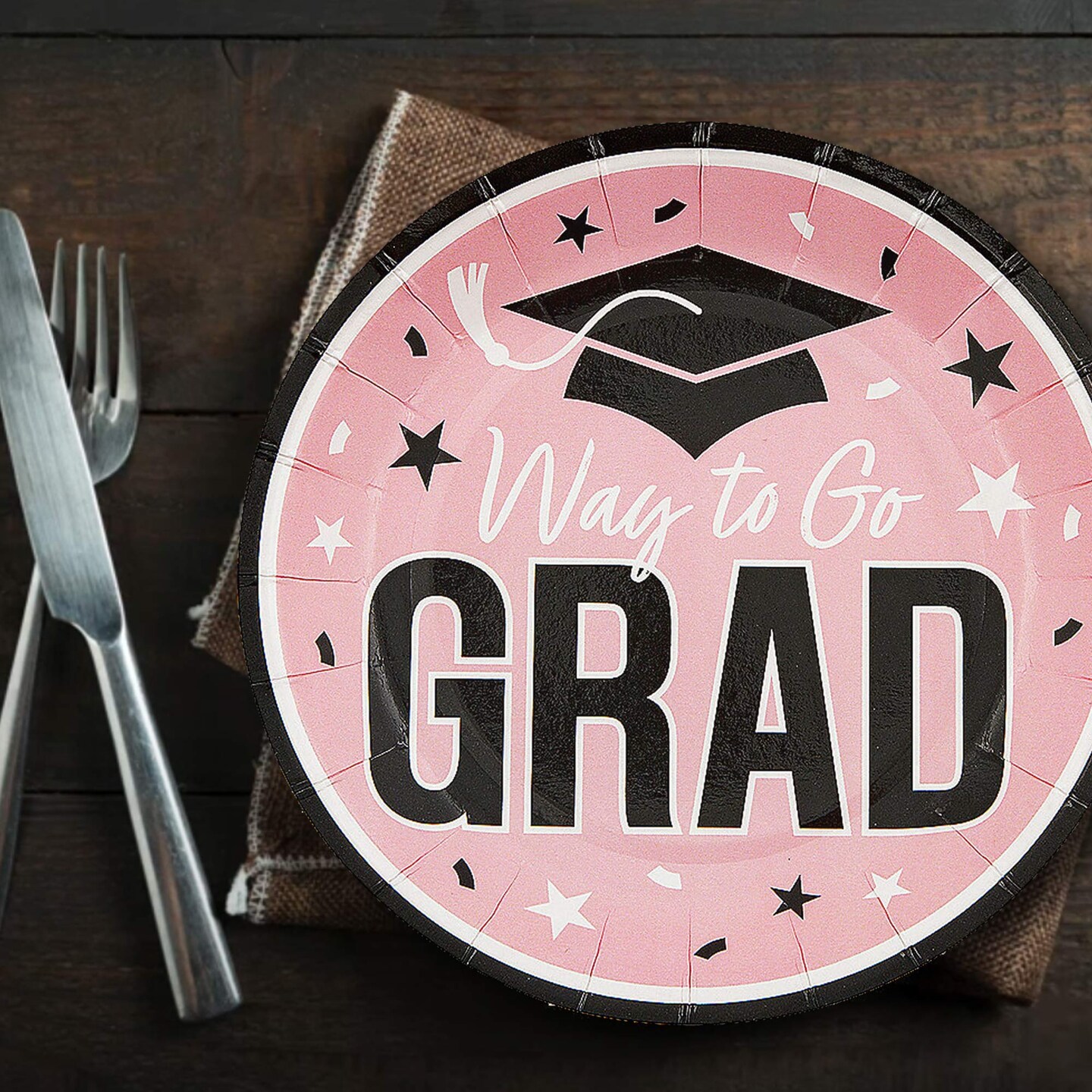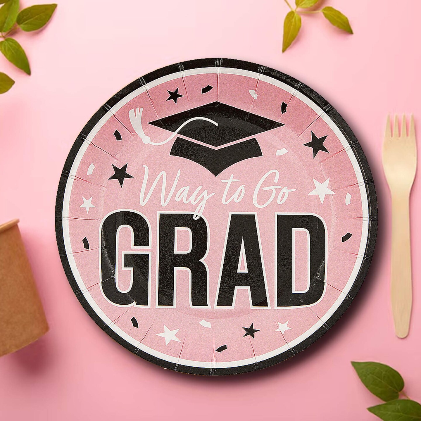 25 Count Pink Way to Go Grad Dessert Plates 7.25 Inch Graduation Party Disposable Plates