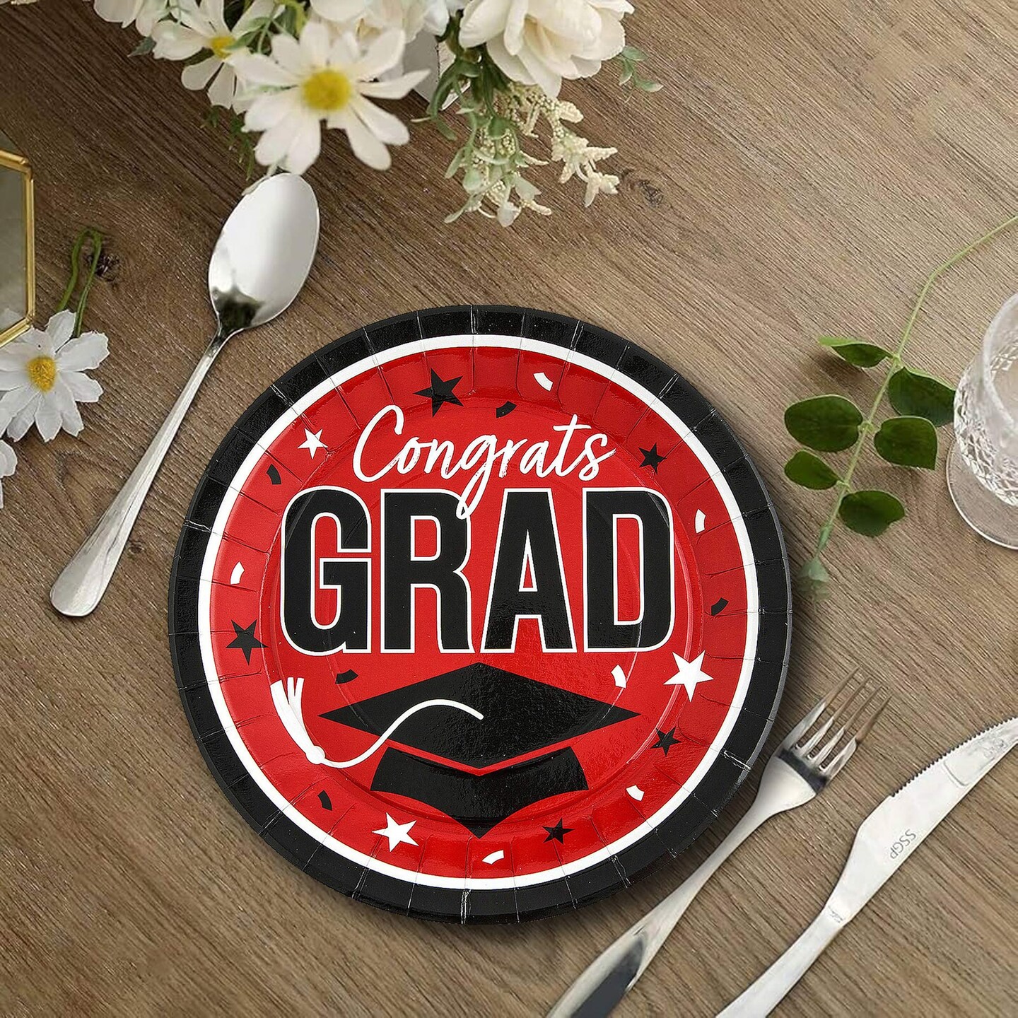 25 Count Red Congrats Grad 9 Inch Paper Plates Round Graduation Party