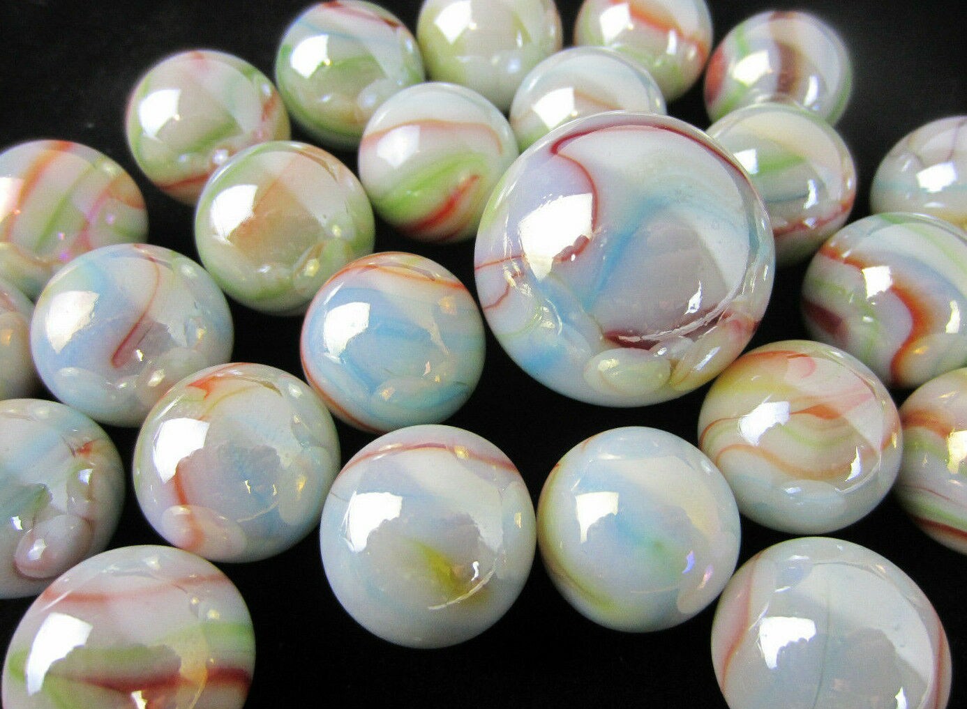 25 Glass Marbles UNICORN Pink/White/Orange/blue game vtg style Swirl Shooter