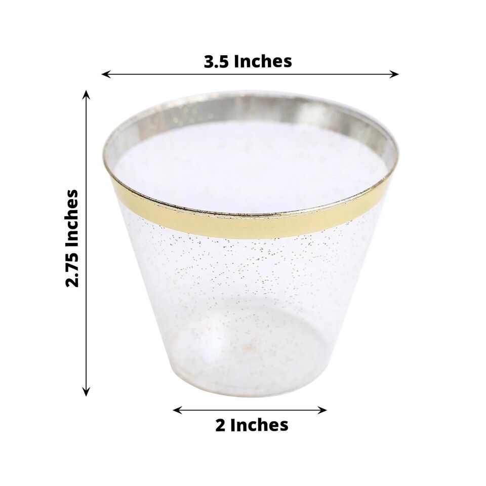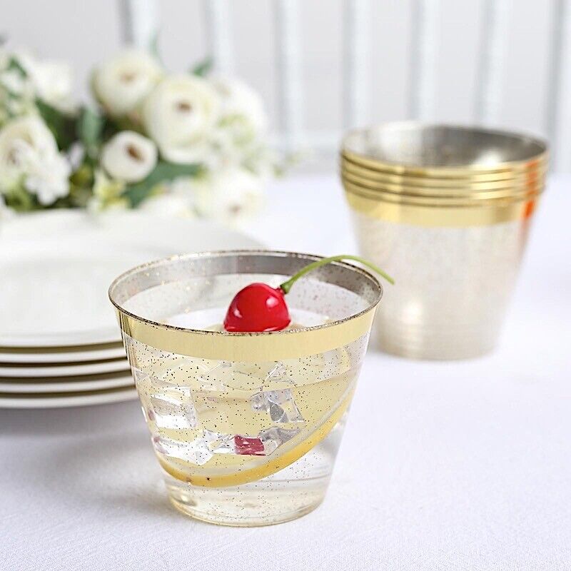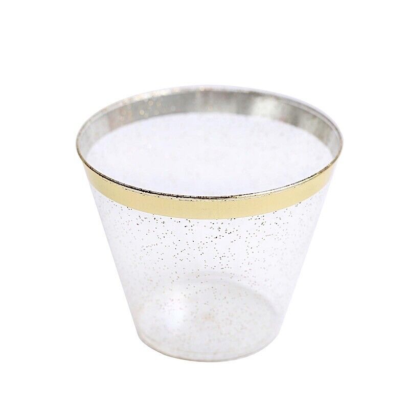 25 Glittered 9 oz Clear Plastic Disposable CUPS Gold Trim