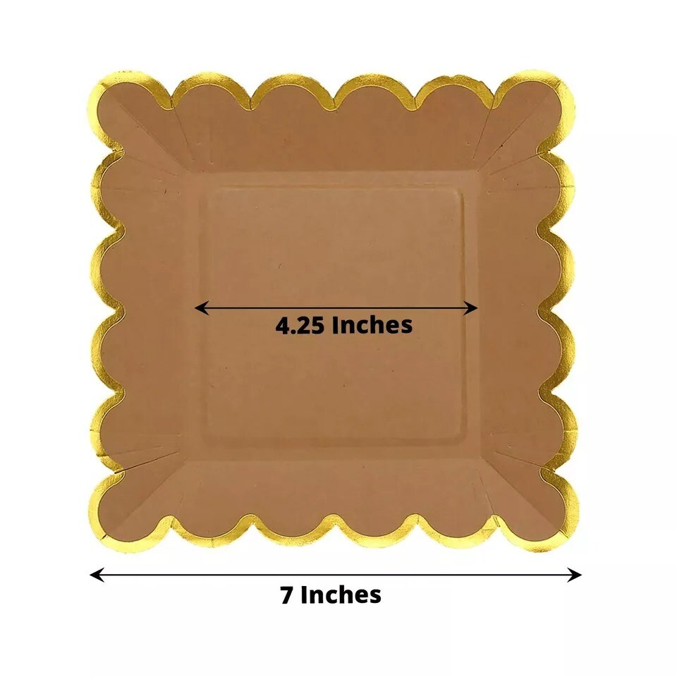 25 Natural 7" Square Disposable Salad Paper PLATES Gold Scalloped Trim Party