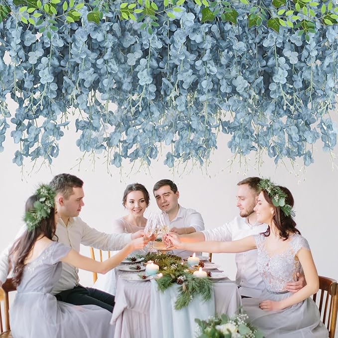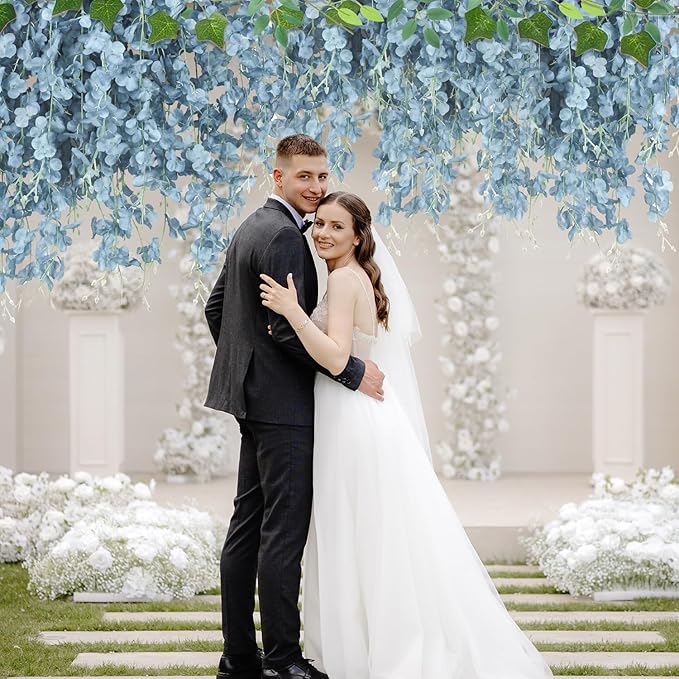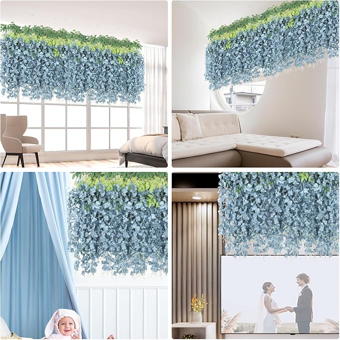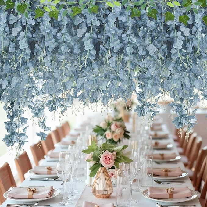 25 Pcs Artificial Wisteria Hanging Flowers 3.6ft Dusty Blue Fake Hanging Flowers Garland Silk Flowers Rattan String Faux Wisteria Vine for Wall Home Wedding Party Arch Greenery Backdrop Decor