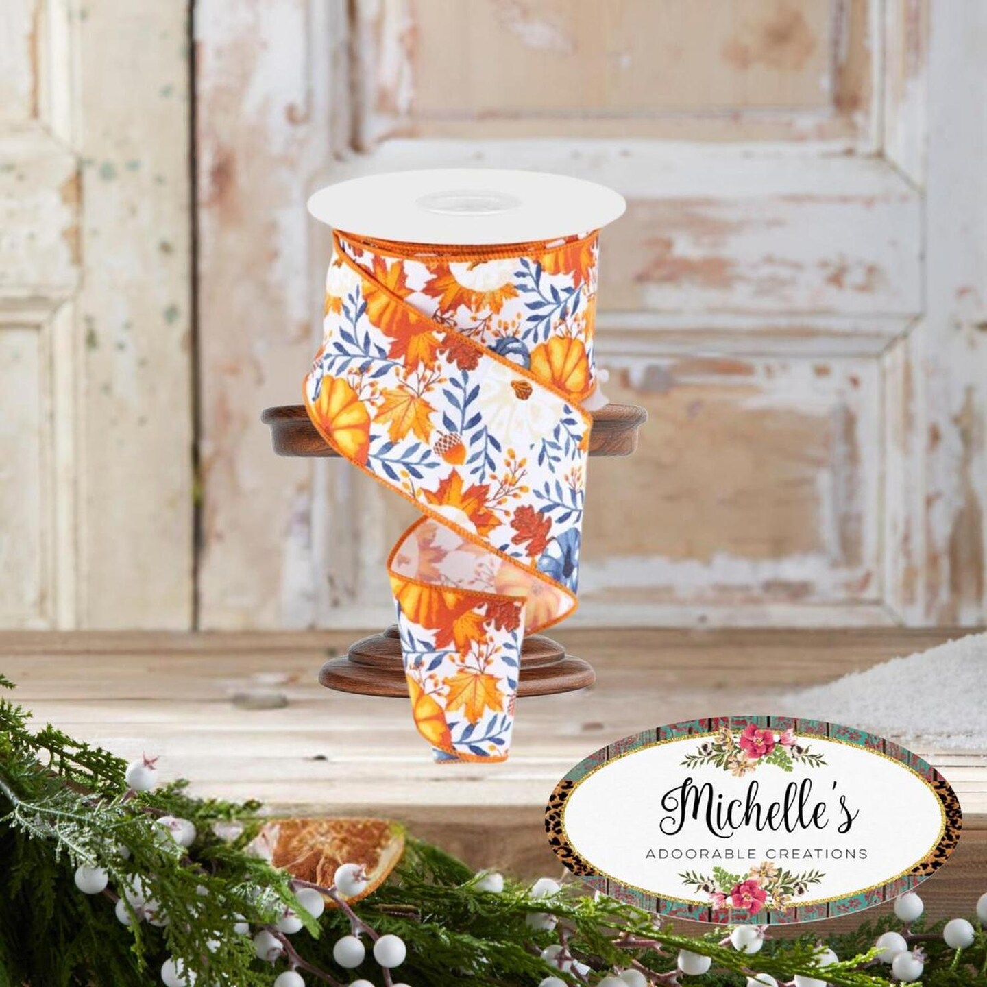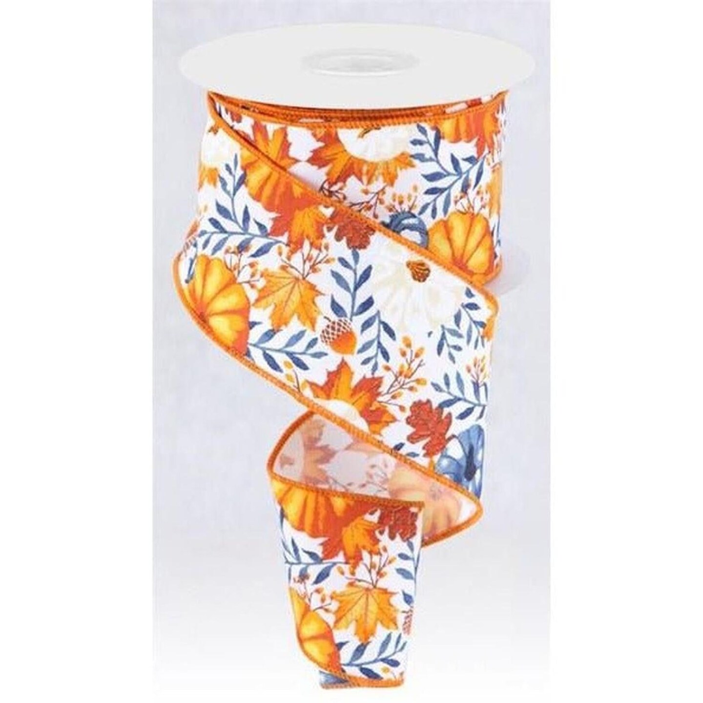 2.5" Pumpkin Foliage Ribbon: White/Navy (10 Yards)