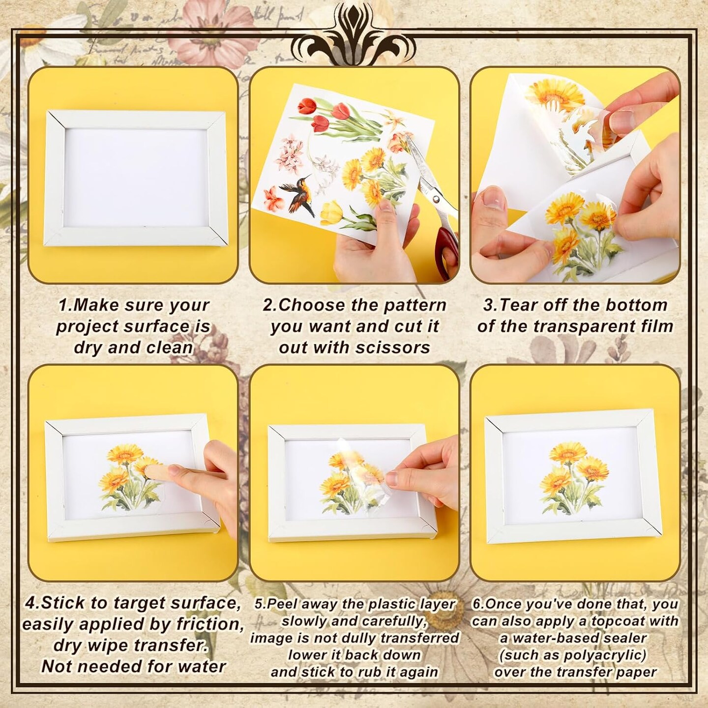 25 Sheets Vintage Flower Rub on Transfer for Crafts 5.9"L x 5.9"W