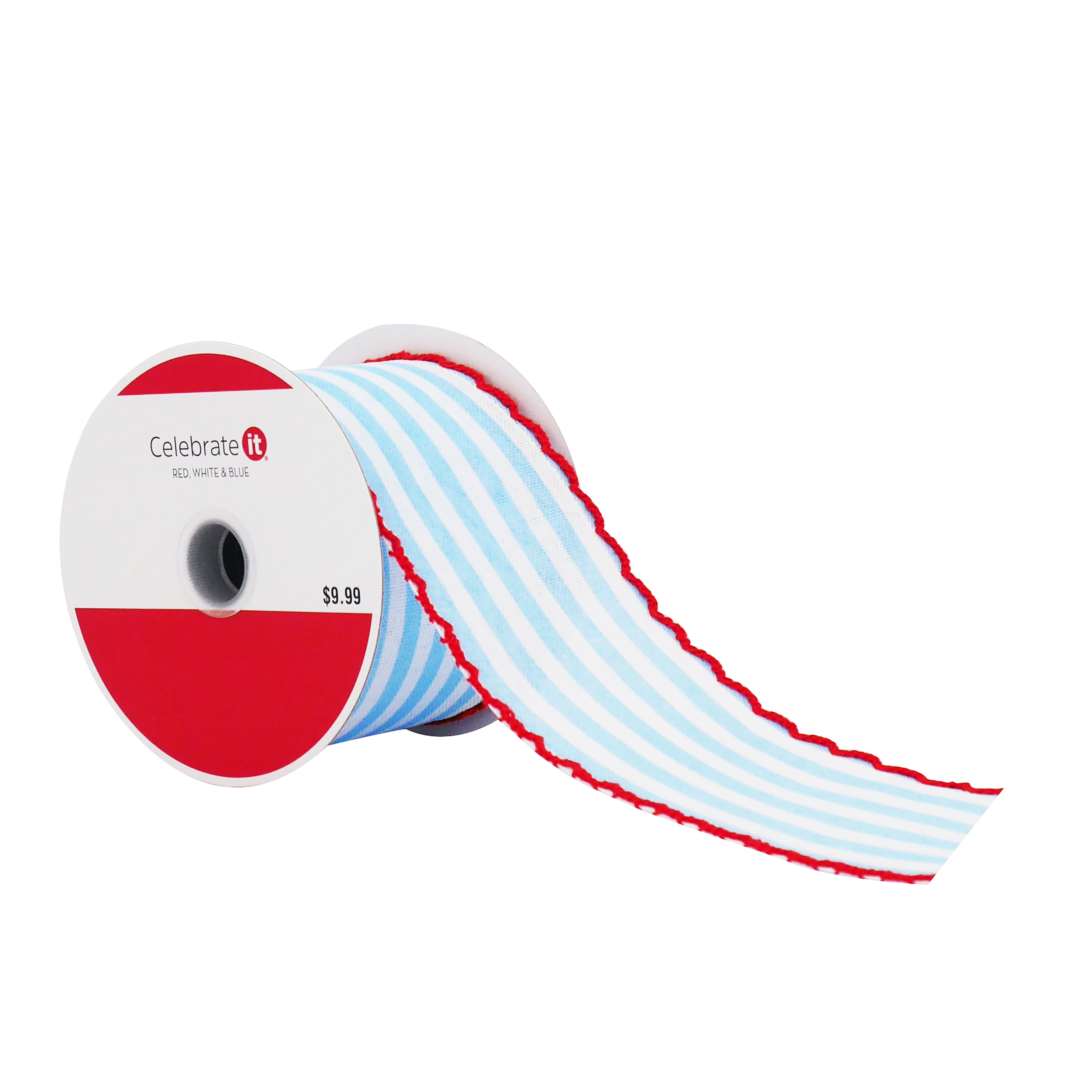 2.5" x 5yd. Blue & White Stripes with Red Edge Wired Cross Linen Ribbon by Celebrate It®