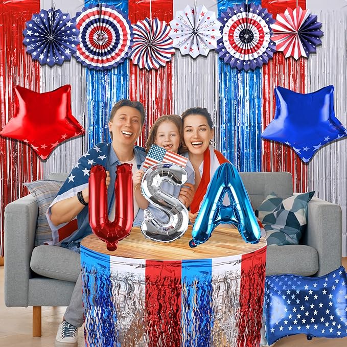 250th Anniversary USA Patriotic Party Supplies Set - 4th of July Independence Day Decorations with Hanging Paper Fans, Foil Fringe Curtains, Table Skirt & USA Flag Foil Balloon - 2026 Sestercentennial America Decor