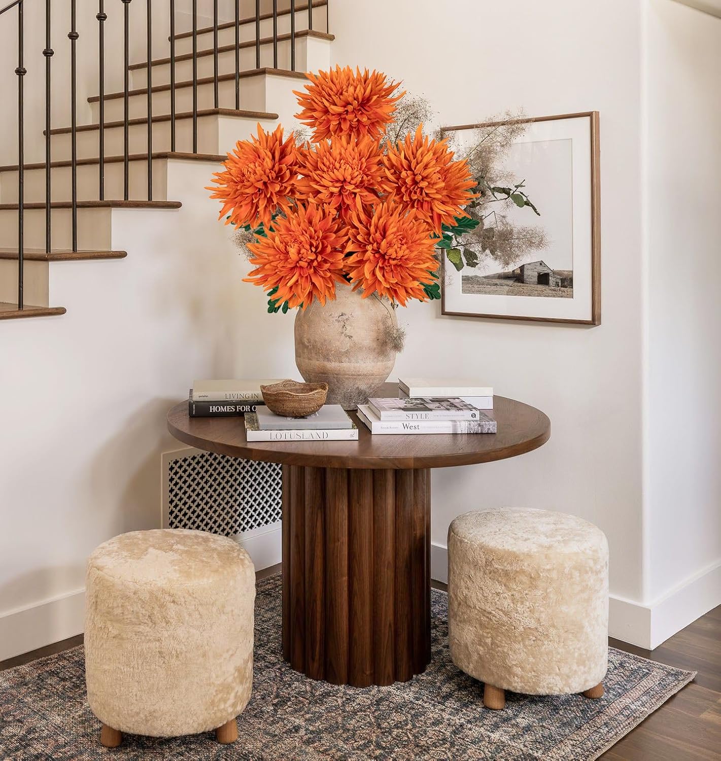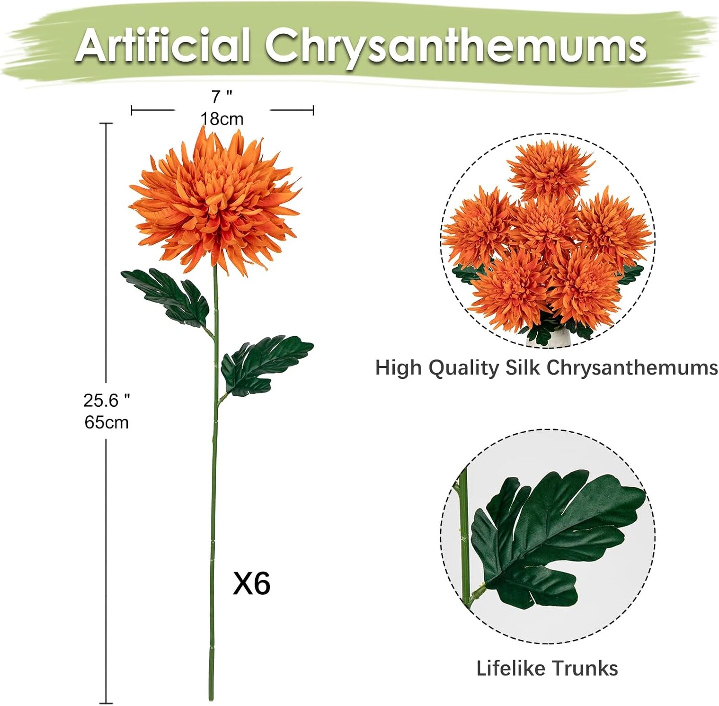 25.6" Long - 6Pcs Orange Artificial Mums Flowers Large Chrysanthemum