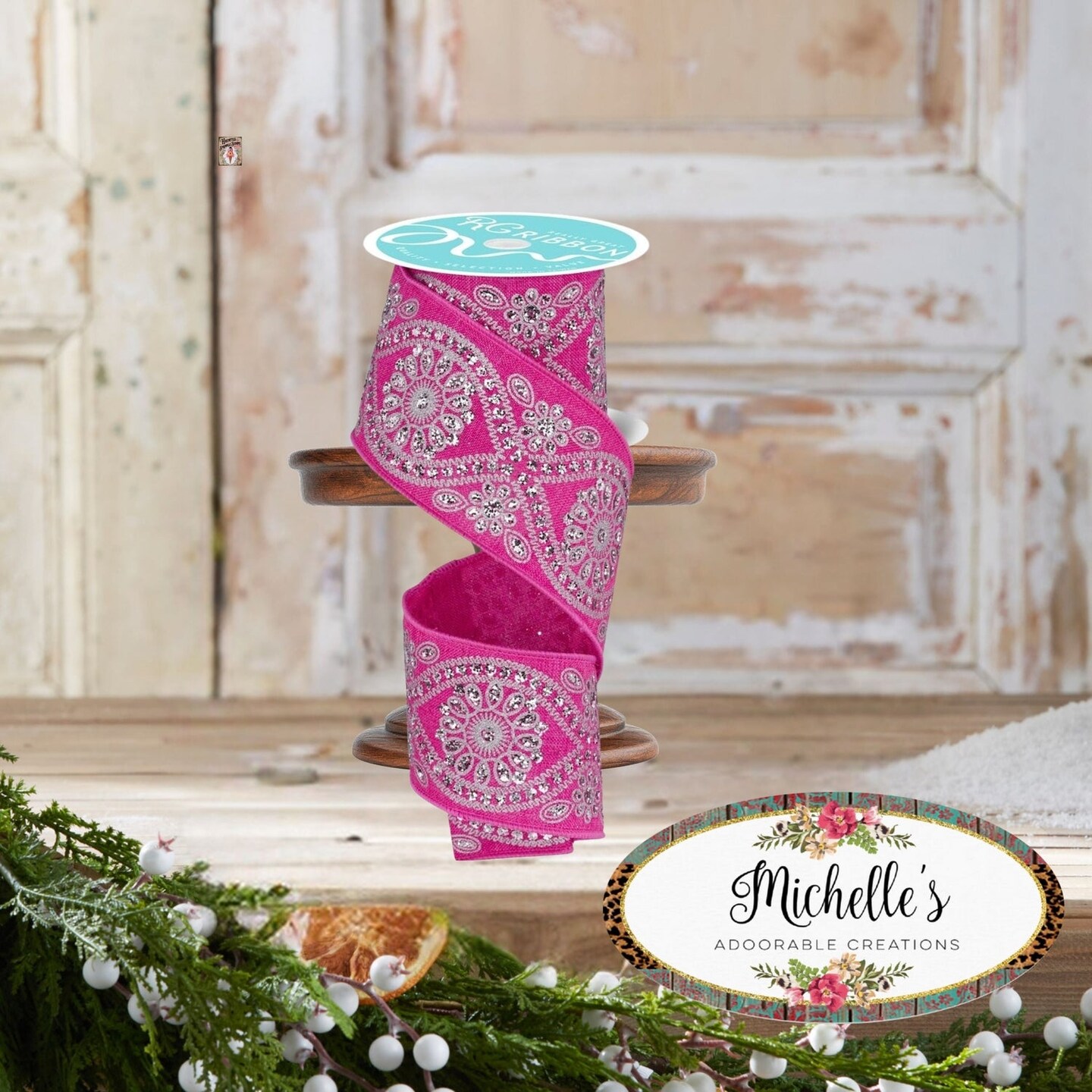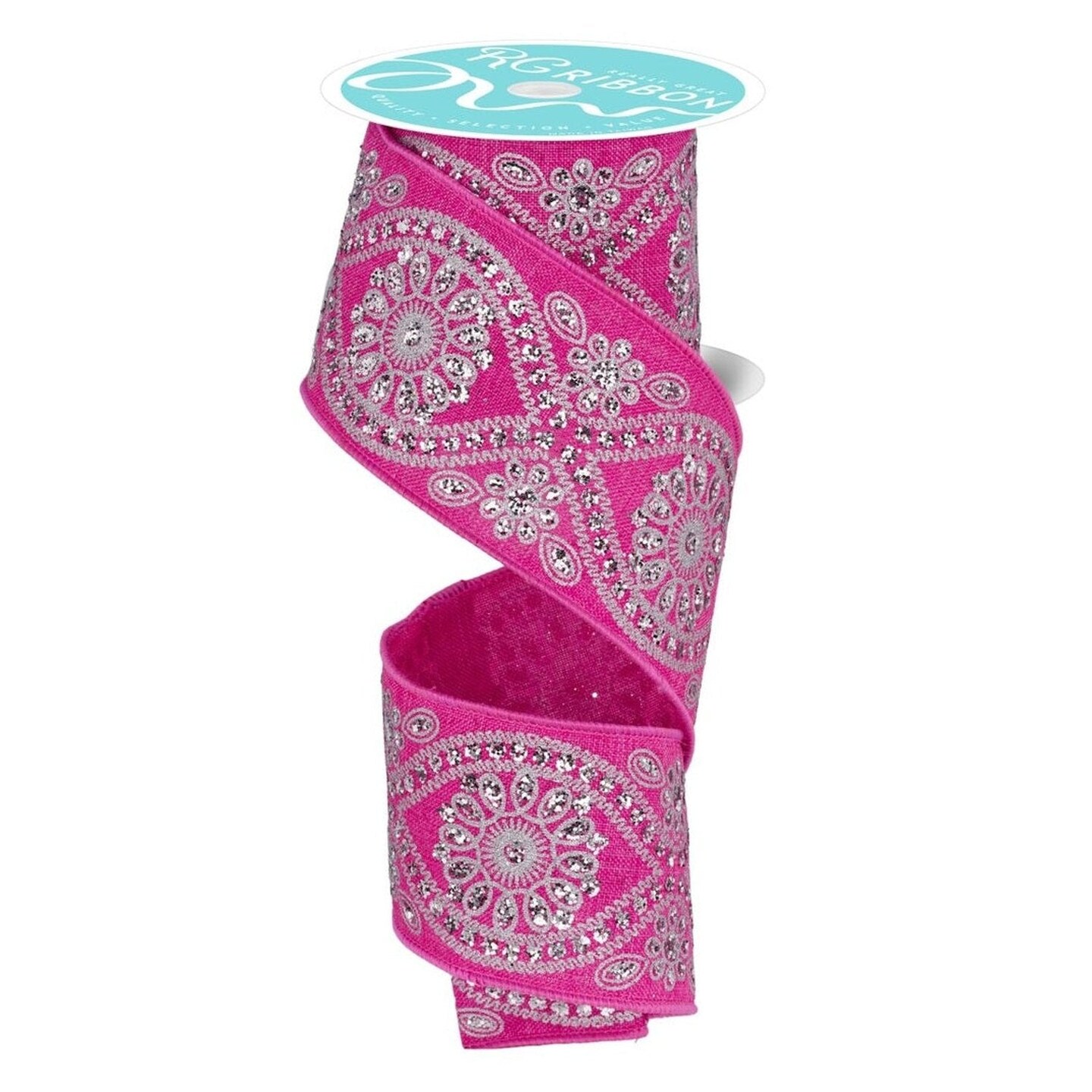 2.5in Deluxe Wavy Floral Ribbon: Fuchsia/Silver (10 Yards)