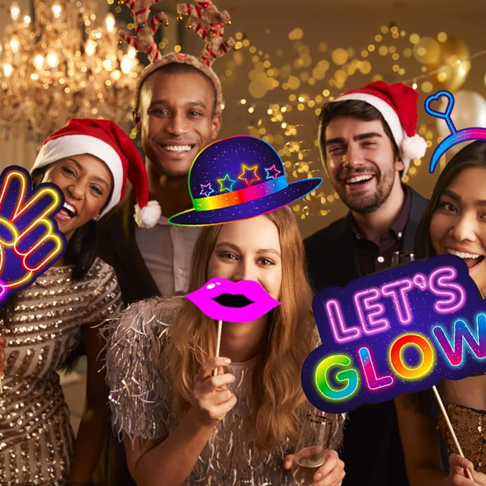 25pcs Glow Neon Photo Booth Props with Stick, Photo Props for Birthday Let's Glow Themed Neon Glow in The Dark Disco Black Light Party Decoration Supplies