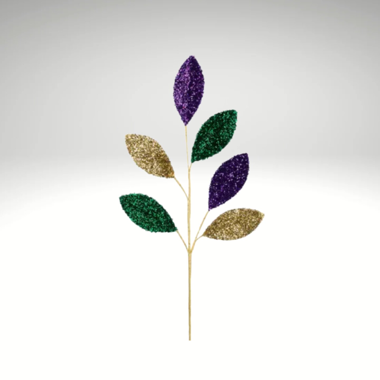 27" Mardi Gras Glitter Magnolia Leaf Spray – Purple, Green, Gold Foil Stem-HG3330