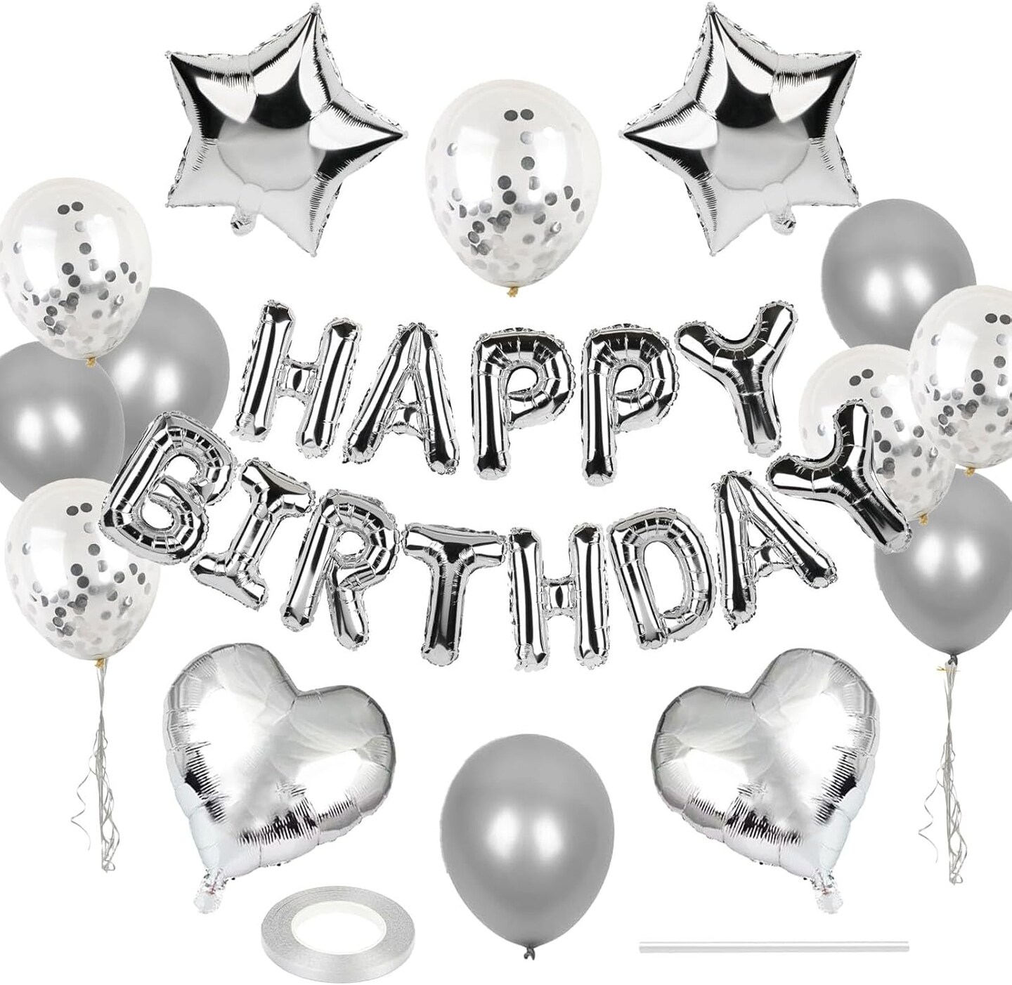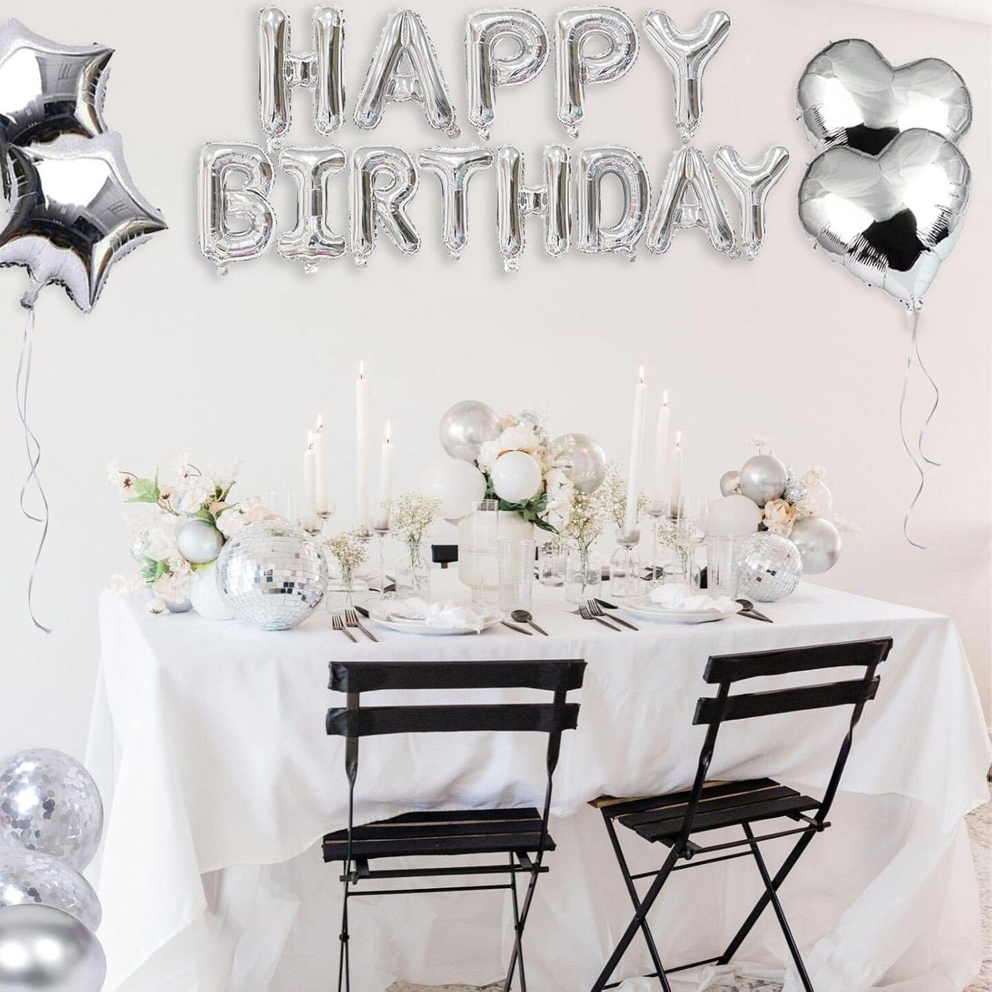 27 Pcs Silver Birthday Decorations, 3D Foil Silver Happy Birthday Balloon Banner
