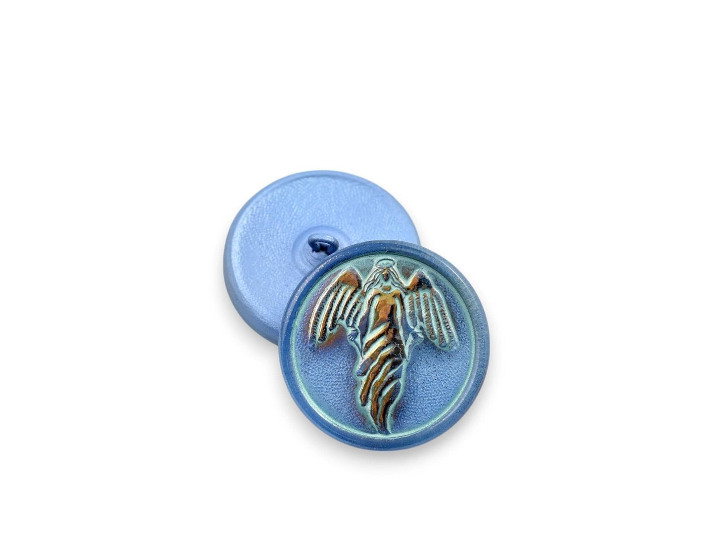 27mm Round Guardian Angel Button - Blue w/ Platinum & Turquoise Wash - Czech Glass Buttons