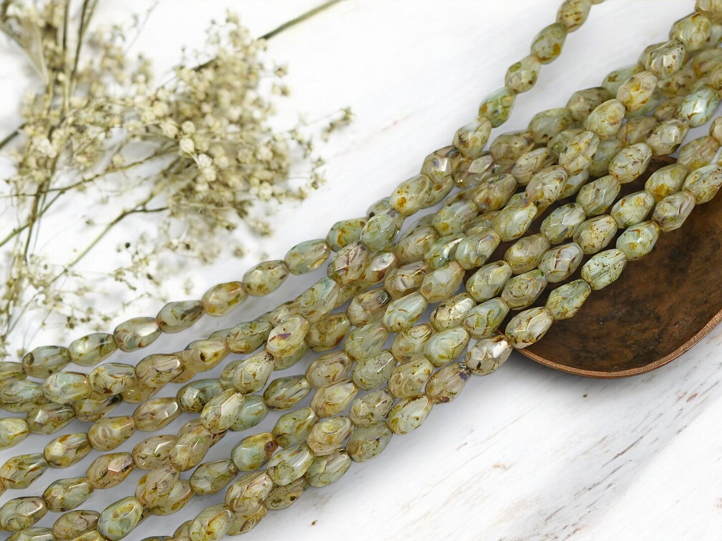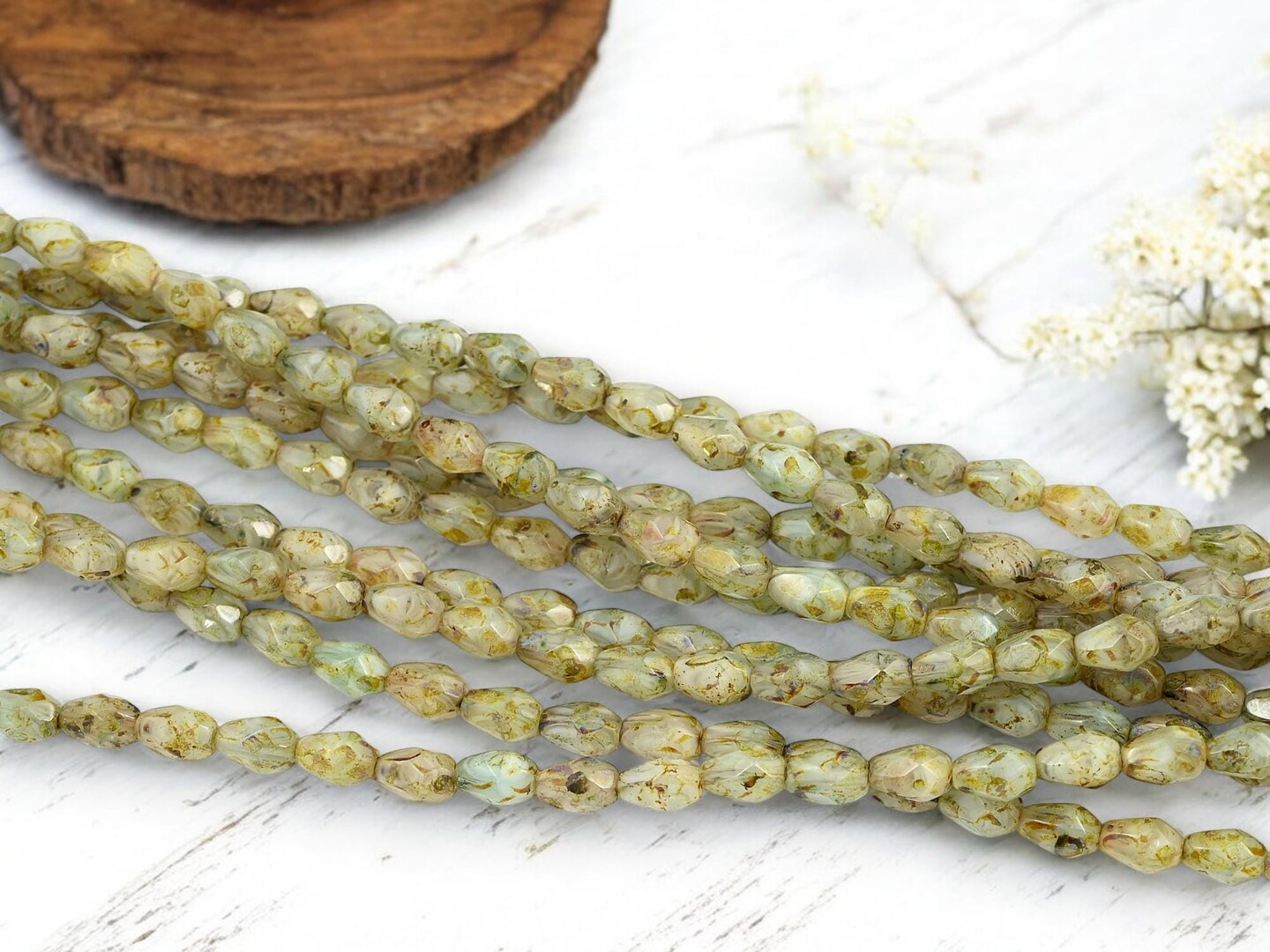 *29* 5x7mm Pale Sage Travertine Fire Polished Tear Drop Beads
